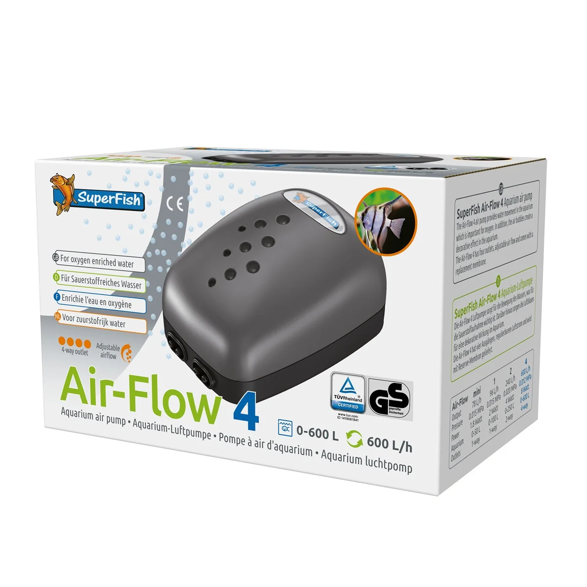 Ultra veilig luchtpompen voor zuurstof verrijkt water, ontworpen voor aquarium gebruik. Bij iedere pomp wordt een gratis reserve membraan meegeleverd, zo bent u verzekerd van langdurig gebruik. De Air-Flow mini en Air Flow 1 hebben één uitlaat, de Air Flow 2 heeft er twee en Air Flow 4 heeft vier uitlaten met regelbare luchtstroom.