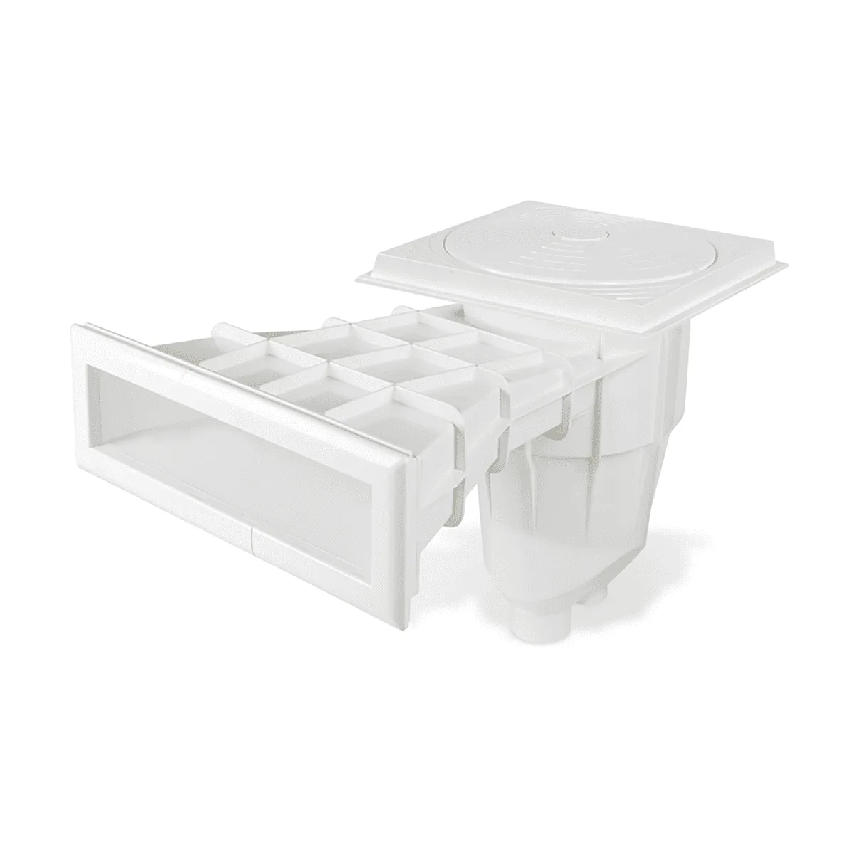 Deze skimmer biedt flexibele aansluitmogelijkheden met een keuze uit Ø50 mm F of Ø63 mm F, waardoor hij eenvoudig kan worden geïntegreerd in bestaande zwembadinstallaties. Dankzij de hoge plaatsing van de skimmer op de waterlijn blijft deze effectief, zelfs bij variërende waterstanden.