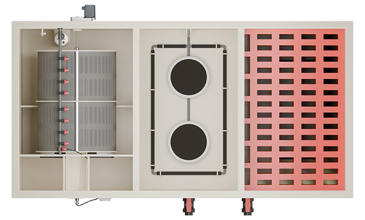 Het hart van het systeem is een hoogwaardige trommelfilter met een 120 micron trommelscherm. Zelfs zeer fijne vuildeeltjes worden effectief uit het water verwijderd.