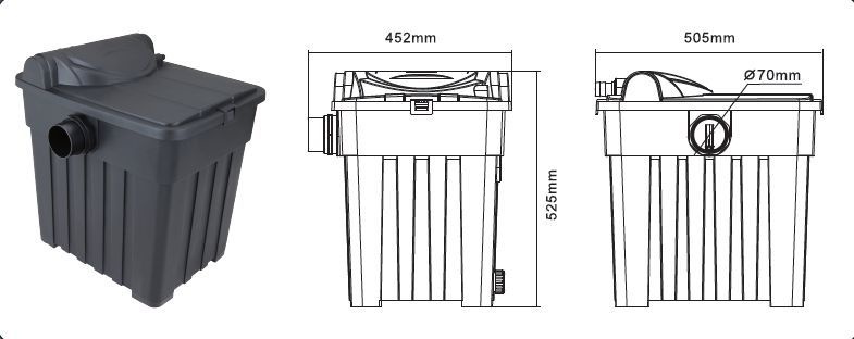 Let op: dit model wordt geleverd zonder filtermedia. Geschikt voor gebruik met sponzen, bio-ballen of ander biologisch filtermateriaal (optioneel verkrijgbaar).