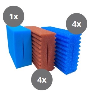 Complete Set met Geribbeld Ontwerp: De totaalset bevat 4 stuks grof/blauw, 4 stuks fijn/rood en 1 stuk extra fijn/blauw filterschuim. Het geribbelde ontwerp vergroot het oppervlak voor effectievere filtratie.
