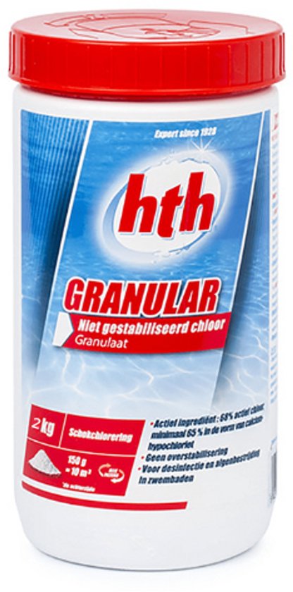 Chloorgranulaat 65% - 2 kg - HTH is een krachtig en effectief desinfectiemiddel voor het onderhouden van zwembadwater. Het granulaat bevat 65% actief chloor, dat snel bacteriën, algen en vuil bestrijdt, wat resulteert in helder, schoon water. Het is ideaal voor het regelmatig behandelen van zwembadwater en het verbeteren van de waterkwaliteit. Het product is eenvoudig op te lossen en zorgt voor een efficiënte chloorbehandeling, waardoor uw zwembad altijd veilig en fris blijft. Geschikt voor zowel particulieren als professionele zwembaden.