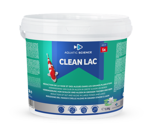 Aquatic Science Clean-Lac 3,5 kg is ontwikkeld om de waterkwaliteit te verbeteren in vijvers of waterlichamen waar filtratie niet mogelijk is. De unieke formule combineert mineralen, zuurstofverrijking en bacteriële werking om vervuiling te verwijderen, de minerale balans te herstellen en fosfaten te reduceren — de belangrijkste oorzaak van algenbloei.