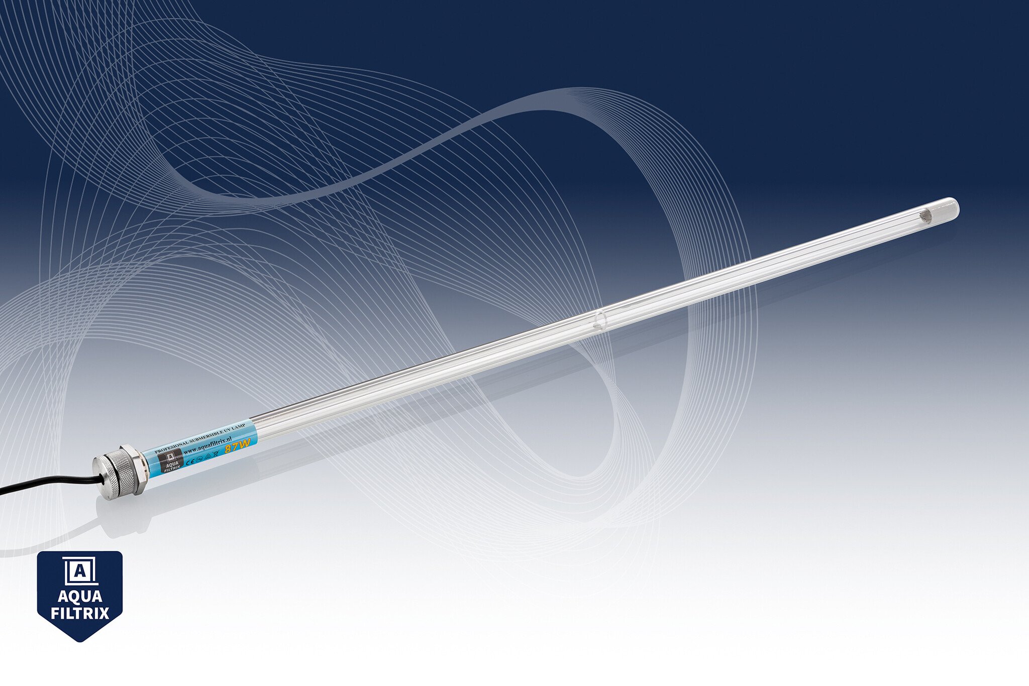 De Aquafiltrix 87W is volledig IP68‑waterdicht, voorzien van een stevige waterbestendige connector en een extra lange aansluitkabel van 5 meter voor flexibele installatie. De lamp bestrijdt effectief bacteriën, virussen, algen en micro‑organismen, volledig zonder chemicaliën.
