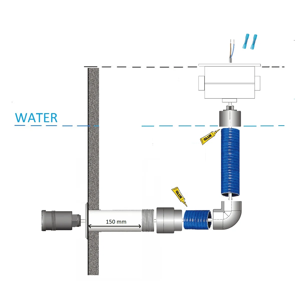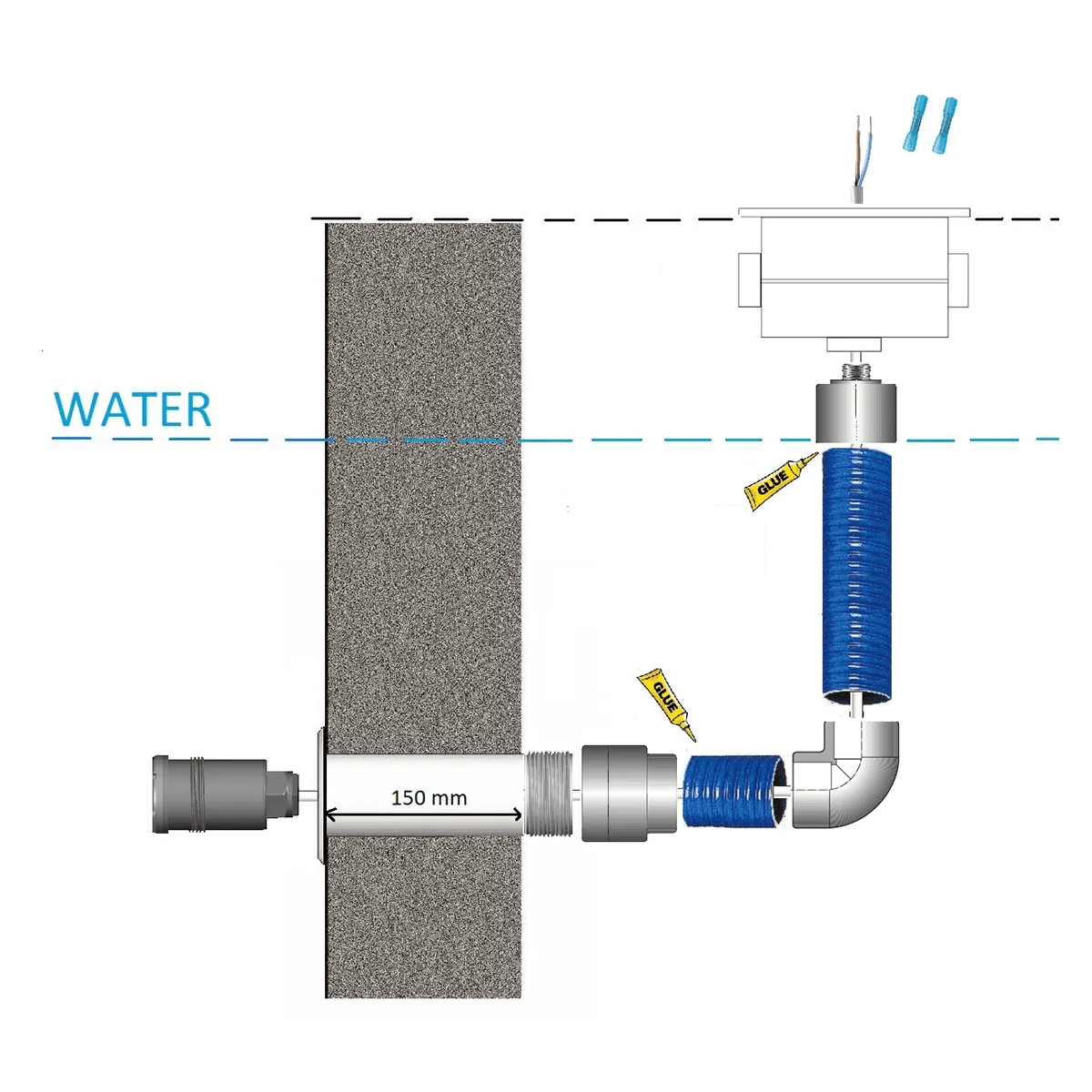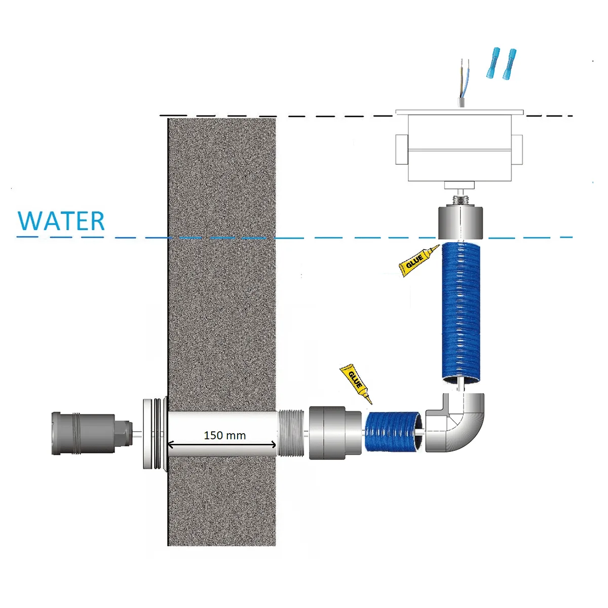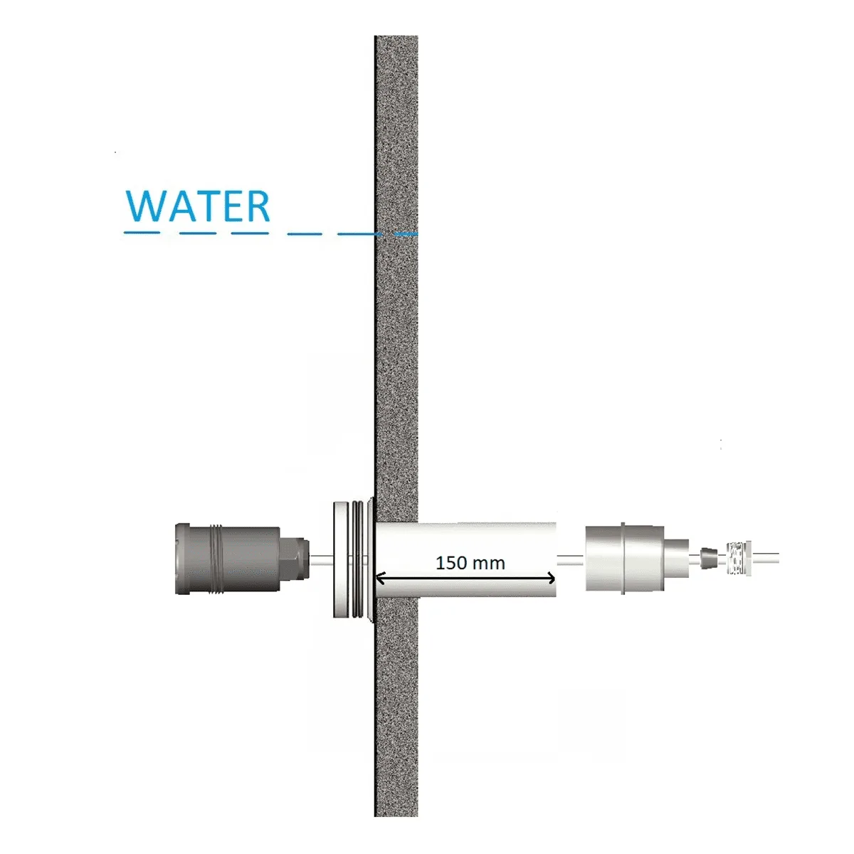 De projector is eenvoudig te installeren via een 1½” buitendraad aansluiting. Er is geen specialistisch gereedschap nodig: een geschikte wanddoorvoer met 1½” stofzuigeraansluiting volstaat. Het achterste gedeelte van de lamp wordt rechtstreeks ingeschroefd, wat installatietijd en foutmarges aanzienlijk vermindert. Let op dat de stofzuigeraansluiting geen stopdraad bevat die ongeschikt is voor dit type lamp.