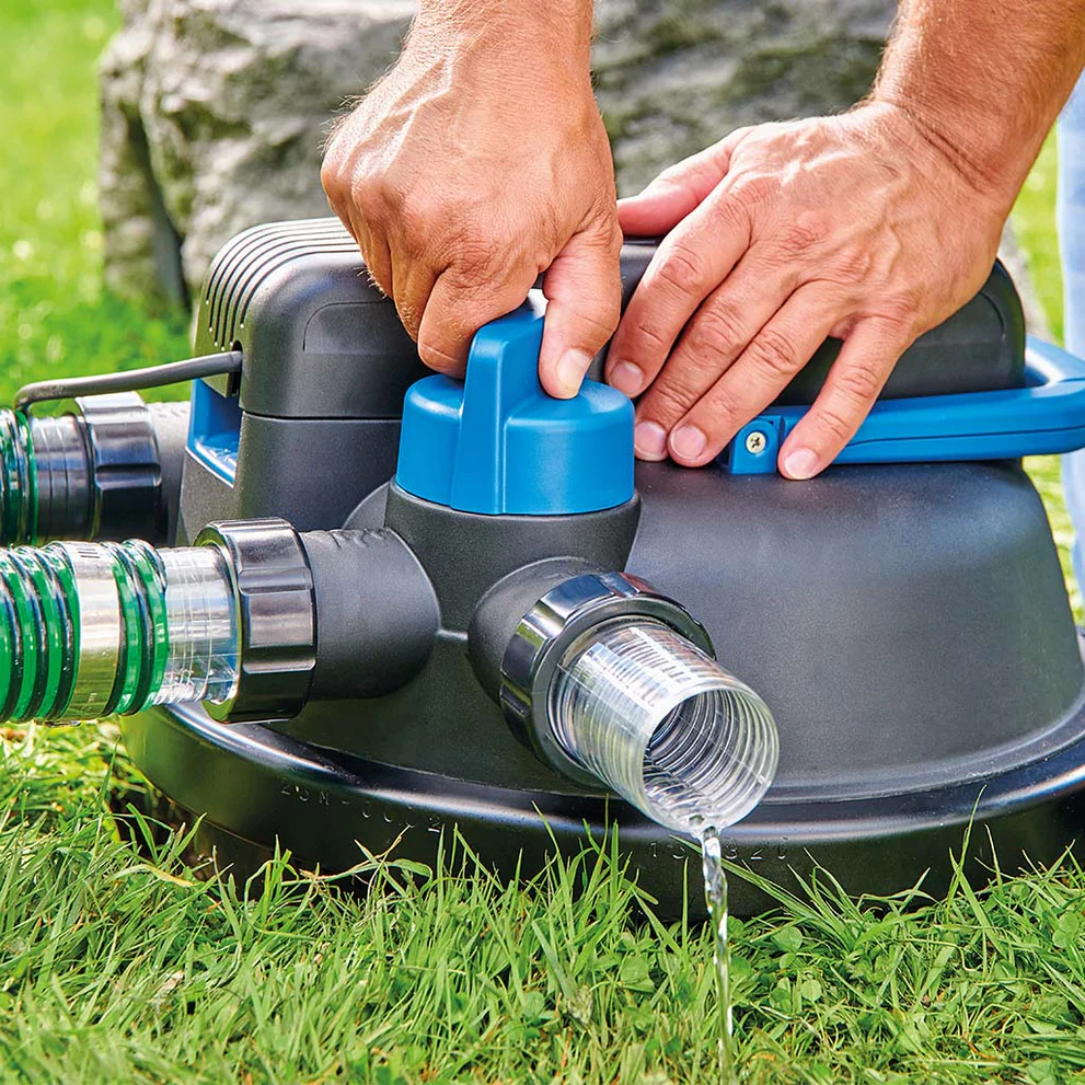Als drukfilter behoudt de FiltoClear 13000 waterdruk, wat ideaal is voor het voeden van een beekloop of waterval. Het reinigingsproces is intuïtief en efficiënt: met een simpele beweging van de hendel bovenop de deksel worden de filtersponzen uitgeknepen. Het vuile water wordt vervolgens afgevoerd via het 2-wegventiel, zonder dat het terug de vijver instroomt. Voor grondige reiniging of vervanging open je het filter eenvoudig via de metalen klemring en handige hefboomfunctie.