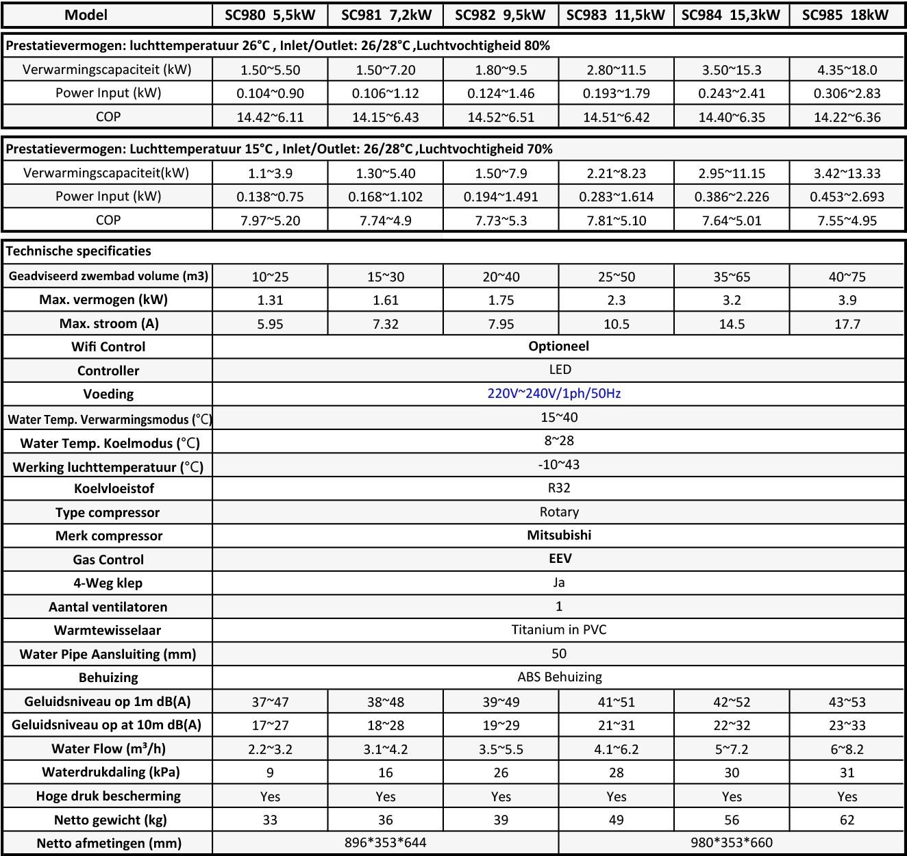 De pomp beschikt over een Mitsubishi invertercompressor, wereldwijd bekend om zijn betrouwbaarheid, duurzaamheid en stille werking. Met een indrukwekkende COP tot 14,5 (Coefficient of Performance) behoort deze warmtepomp tot de zuinigste in zijn klasse. Dit betekent dat je met een minimaal stroomverbruik maximaal rendement behaalt – ideaal voor langdurig gebruik in elk seizoen.