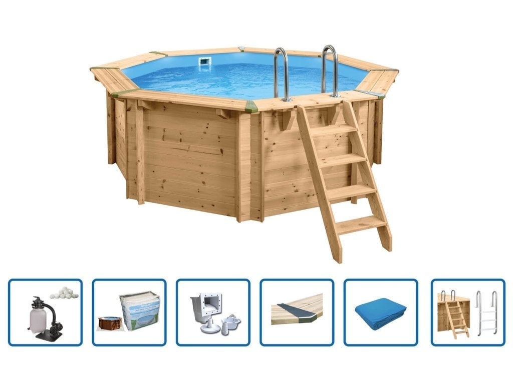 Het Interline Bali rond zwembad 5,30 m Premium pakket is ideaal voor gezinnen en tuinliefhebbers die een ruim en compleet uitgerust houten zwembad zoeken. Dankzij de meegeleverde accessoires en onderhoudsset blijft het zwembadwater eenvoudig schoon en kun je zorgeloos genieten van een luxe zwembad in de eigen tuin.