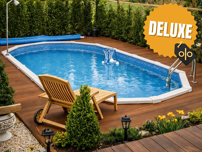 Het Deluxe pakket bevat daarnaast een Fiberclean filterset met zelfaanzuigende pomp, een skimmer, een inlaatfitting, een zwembadkoof en een kunststof A-frame ladder voor opbouw- en inbouwzwembaden. Hiermee beschikt u direct over een complete basis voor gebruiksgemak, filtering en een nette afwerking van het zwembad.