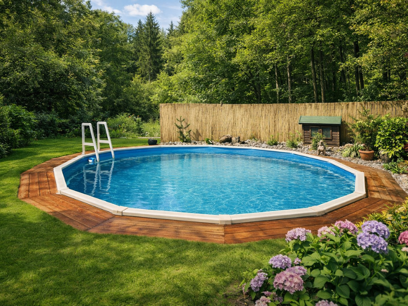 Wanneer het zwembad volledig is opgebouwd of ingebouwd, ontstaat een prachtig permanent zwembad dat jarenlang een centrale plek in de tuin kan innemen.