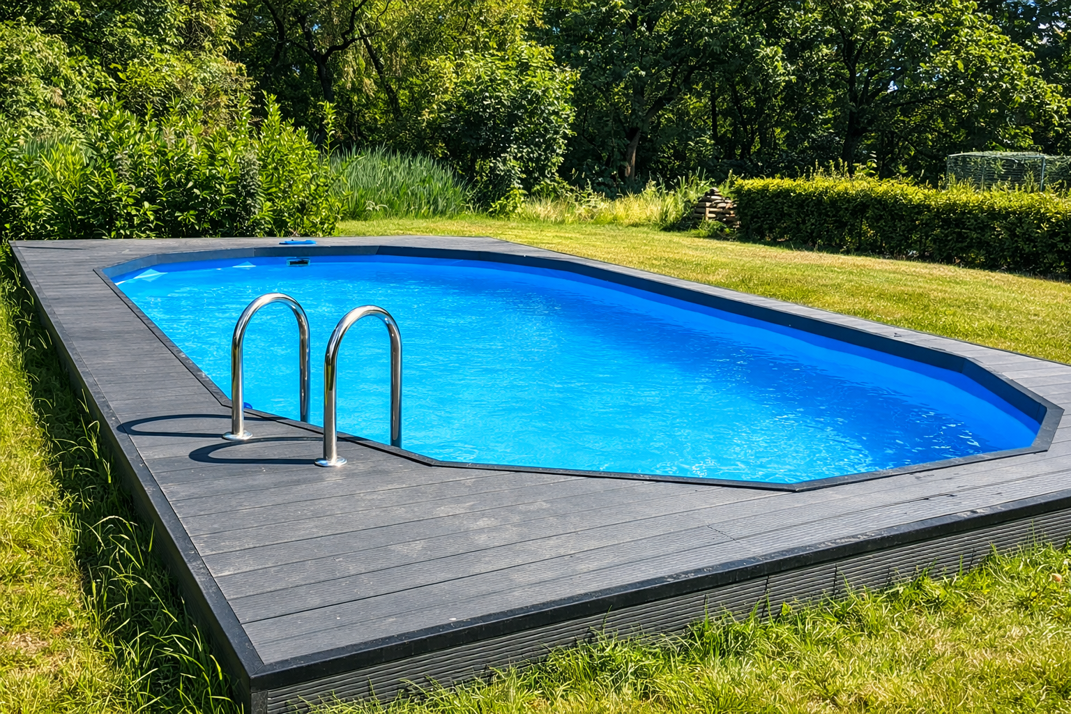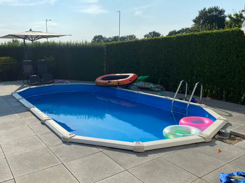 Wanneer het zwembad volledig is opgebouwd of ingebouwd, ontstaat een prachtig permanent zwembad dat jarenlang een centrale plek in de tuin kan innemen.