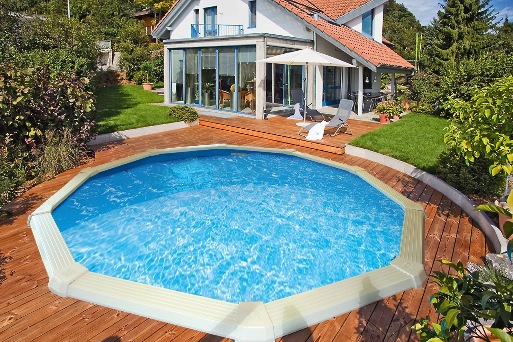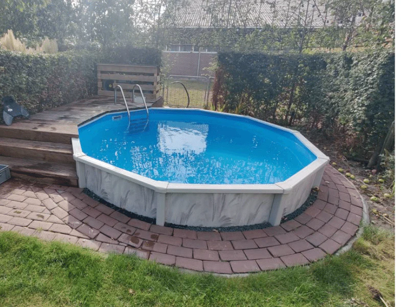 Wanneer het zwembad volledig is opgebouwd of ingebouwd, ontstaat een prachtig permanent zwembad dat jarenlang een centrale plek in de tuin kan innemen.