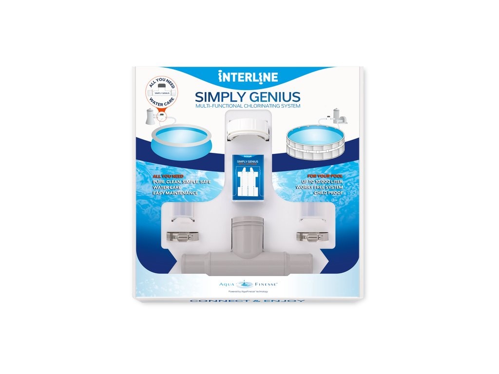 De Simply Genius Starterkit bevat alles wat u nodig heeft om direct te starten: een eenvoudig te installeren doseersysteem en speciale tabletten die op basis van een unieke samenstelling het water behandelen. Het systeem is ontworpen voor zwembaden tot 10.000 liter en werkt volledig zonder drijver, wat het veiliger maakt voor kinderen.