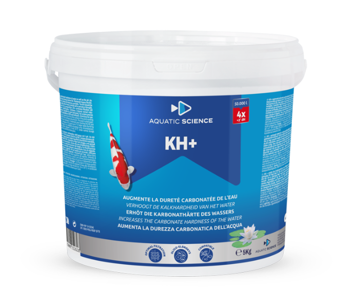 Aquatic Science KH+ 5 kg verhoogt de carbonaathardheid (KH) van het vijverwater en voorziet het tegelijkertijd van essentiële sporenelementen. Een stabiele KH-waarde (tussen 6 en 12°dH) is cruciaal voor het behoud van een constante pH en een goed functionerend biologisch evenwicht. Regenwater verlaagt vaak de KH, wat de filtratie, plantengroei en gezondheid van vissen kan verstoren.