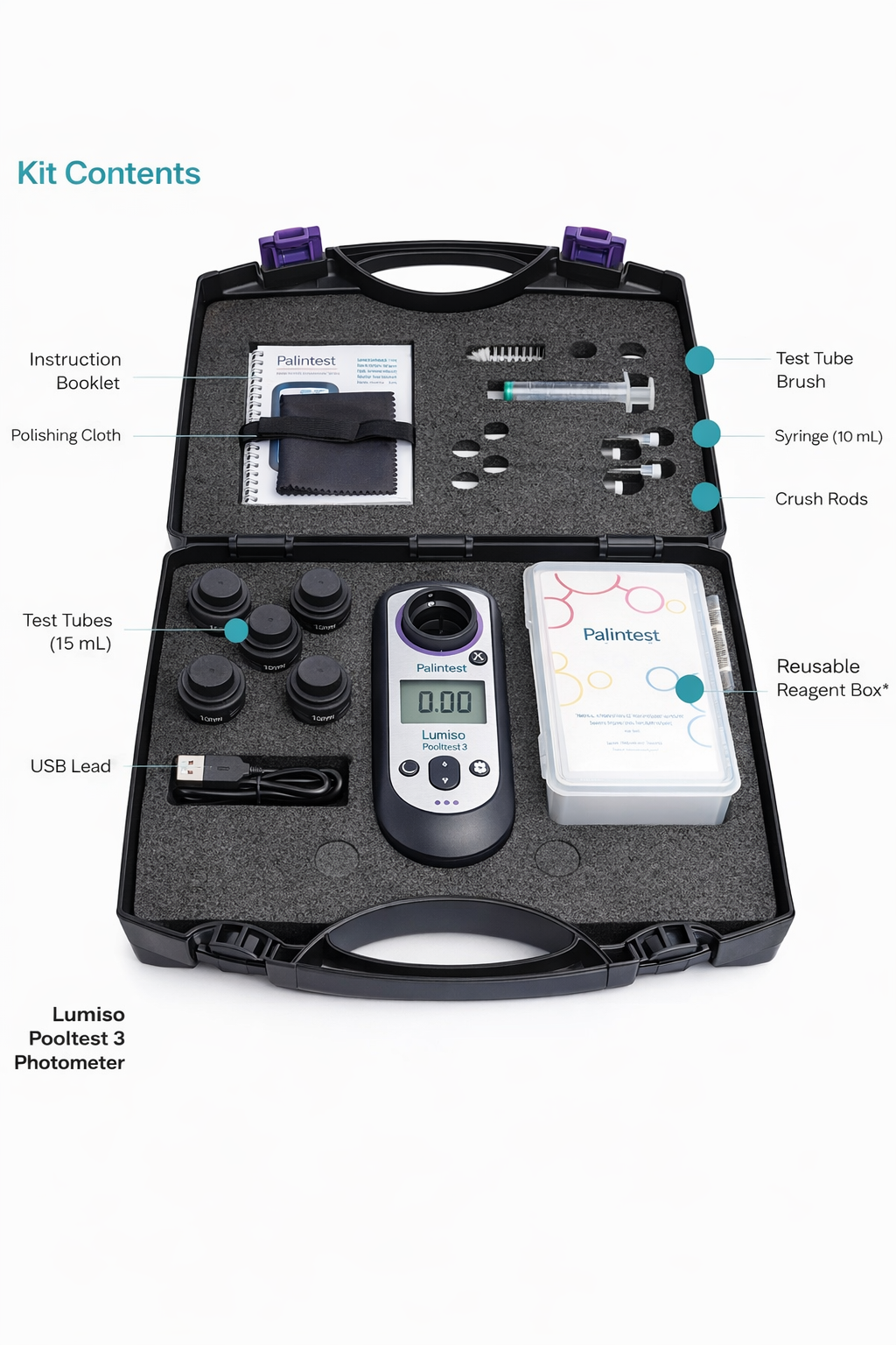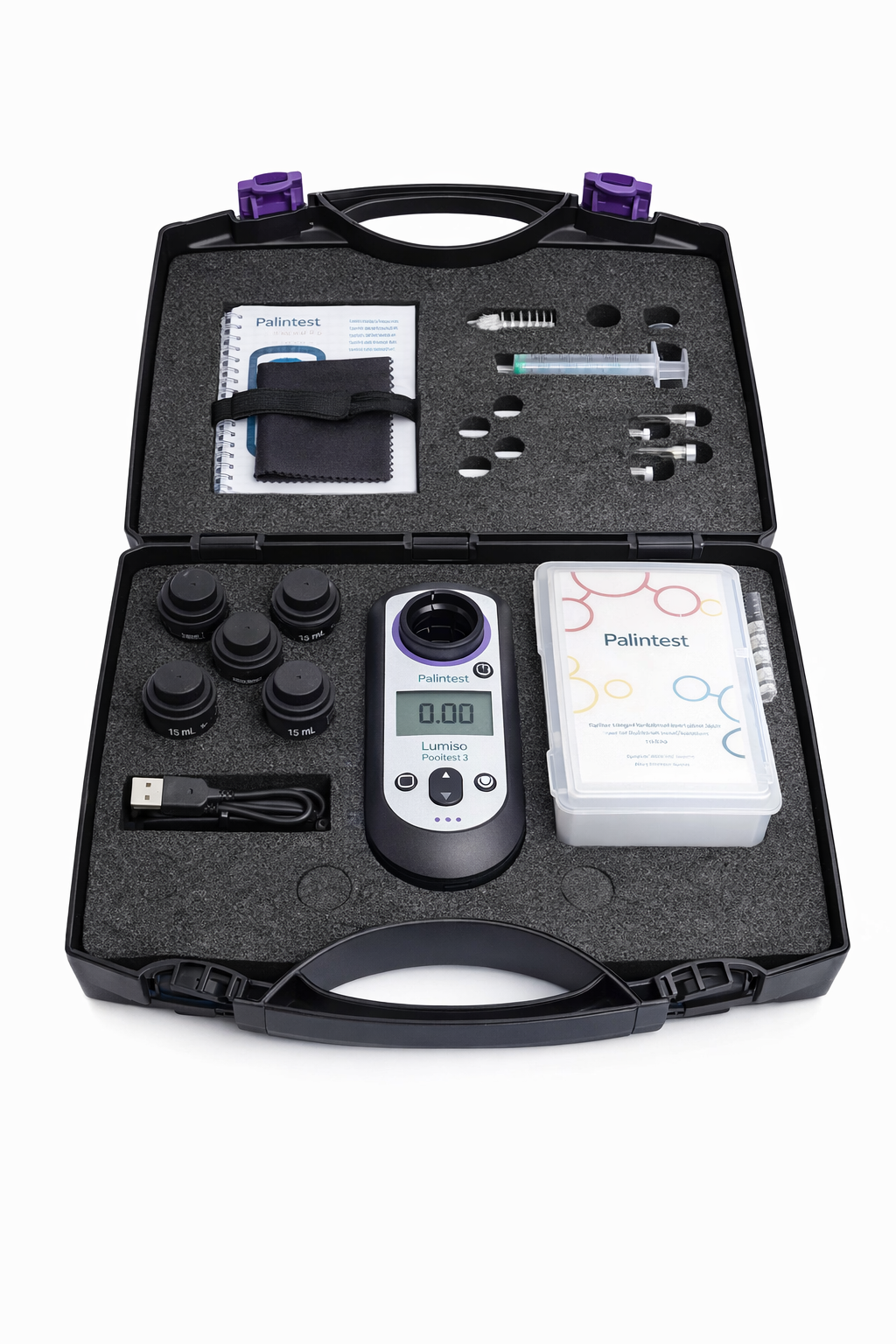 De Lumiso Pooltest 9 wordt geleverd in een stevige transportkoffer met cuvetten, schoonmaakaccessoires, USB-kabel, starter-reagentia en Nederlandstalige handleiding. Een complete oplossing voor professionele wateranalyse en nauwkeurige monitoring van de waterkwaliteit.