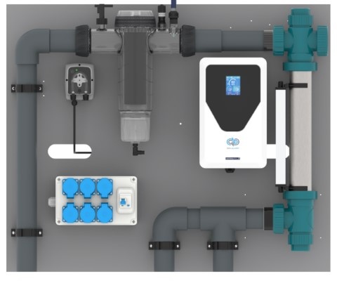 Het systeem is volledig voorgemonteerd en werkt volgens het Plug & Play-principe, waardoor de installatie eenvoudig en snel kan worden uitgevoerd. Het paneel past perfect op de bestaande Plug & Play PVC-panelen en vormt zo een compleet waterbehandelingssysteem.