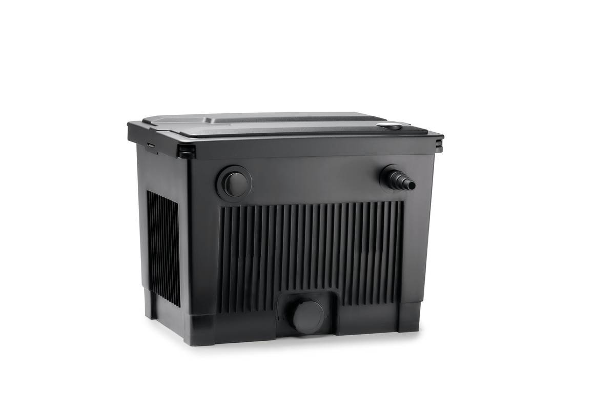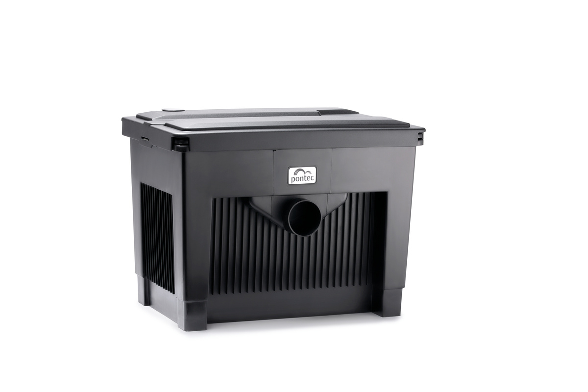 Compact doorstroomfilter voor vijvers tot 20000 liter (zonder visbezetting) met groot filterschuimvolume en overloopbeveiliging. Het filter kan met of zonder optionele UVC-voorverhelderaar worden gebruikt. In combinatie met een PondoTronic UVC 18 W UVC voorfilter en een PondoMax Eco 5000 filterpomp met Pontec helderwater garantie. Eenvoudige reiniging dankzij geïntegreerde vloerafvoer. Met 2 jaar garantie.