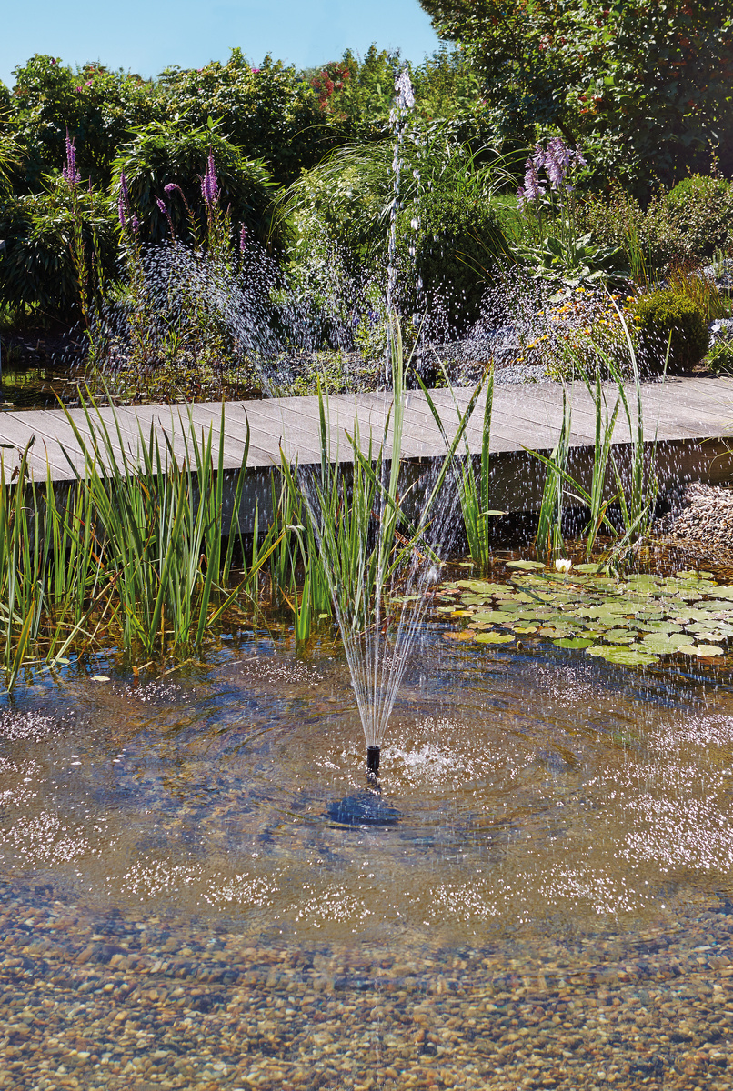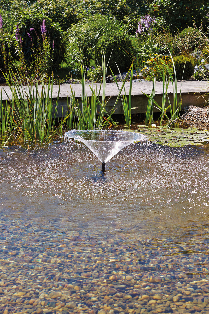 De geïntegreerde vijverpomp levert 1000 liter per uur bij een energiezuinig verbruik van 20 watt. Een draaibare telescoopverlenging maakt het mogelijk om de fonteinhoogte aan te passen aan je wensen, en je kunt kiezen uit vier verschillende fonteinopzetstukken (vulkaan, jets, bel en bokaal) voor een speels of rustgevend waterbeeld.