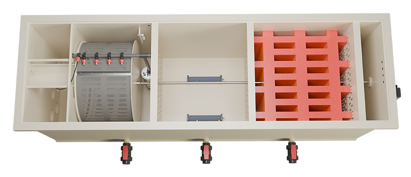 Na de mechanische filtratie stroomt het water door het moving bed filter, waar nuttige bacteriën schadelijke stoffen zoals ammoniak en nitriet omzetten naar onschadelijk nitraat. Dit is essentieel voor een gezonde leefomgeving voor vissen.