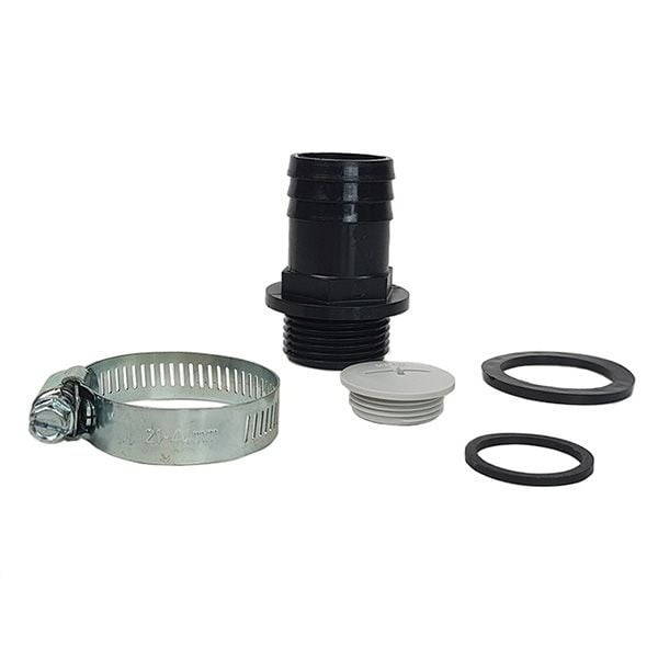 Inbegrepen: slangtule 30/32 1”, wormslangklem 21–44, O-ring, aftapdop M25