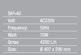 De SK²-40 NG is eenvoudig te installeren en geschikt voor vijvers tot 35 m². Dankzij de stevige constructie, het stille functioneren en de lange kabellengte is dit model ideaal voor langdurig, onderhoudsarm gebruik.
