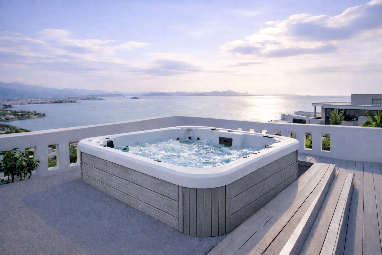 Met compacte maar doordachte afmetingen van 2150 x 1700 x 780 mm past deze spa moeiteloos in zowel exclusieve tuinen als commerciële wellnessomgevingen. De ergonomische kuip is ontworpen voor optimaal zit- en ligcomfort, ondersteund door een krachtig hydromassagesysteem dat zorgt voor diepe ontspanning en spierherstel.