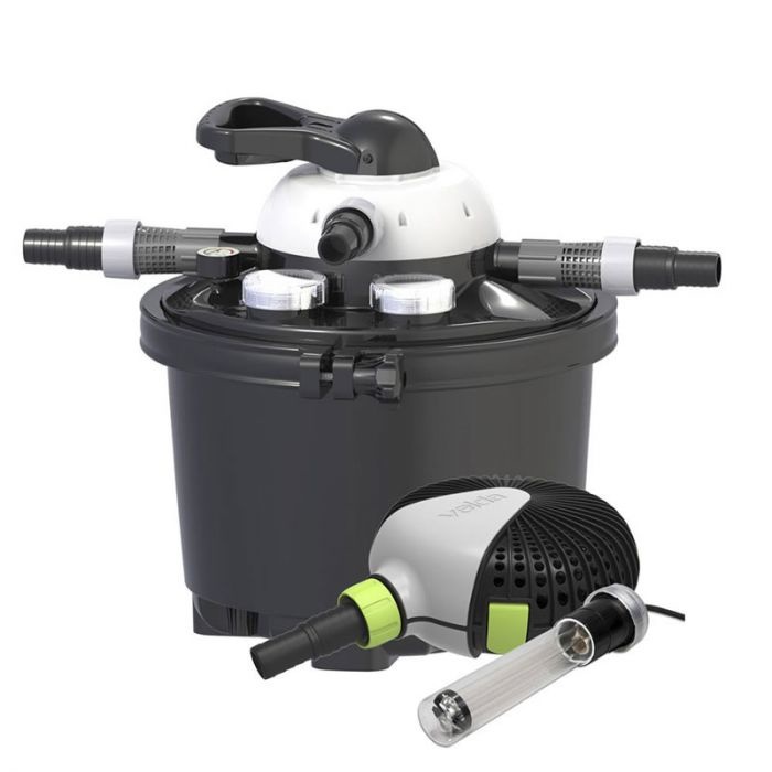 De set wordt geleverd met een geïntegreerde UV-C unit van 9 Watt, die effectief zweefalgen, bacteriën en ziektekiemen bestrijdt en zo zorgt voor kristalhelder water. Daarnaast zorgt de Green Line 10000 vijverpomp met een capaciteit van maximaal 5.000 liter per uur voor een krachtige en energiezuinige watercirculatie.