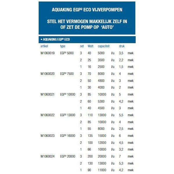 Kortom, de AquaKing EGP²‑20.000 NG biedt een krachtige, betrouwbare en energiezuinige oplossing voor iedereen die een efficiënte watercirculatie en filtratie in vijvers of waterornamenten wil realiseren, en combineert robuustheid, prestaties en gebruiksgemak in één hoogwaardige pomp.
