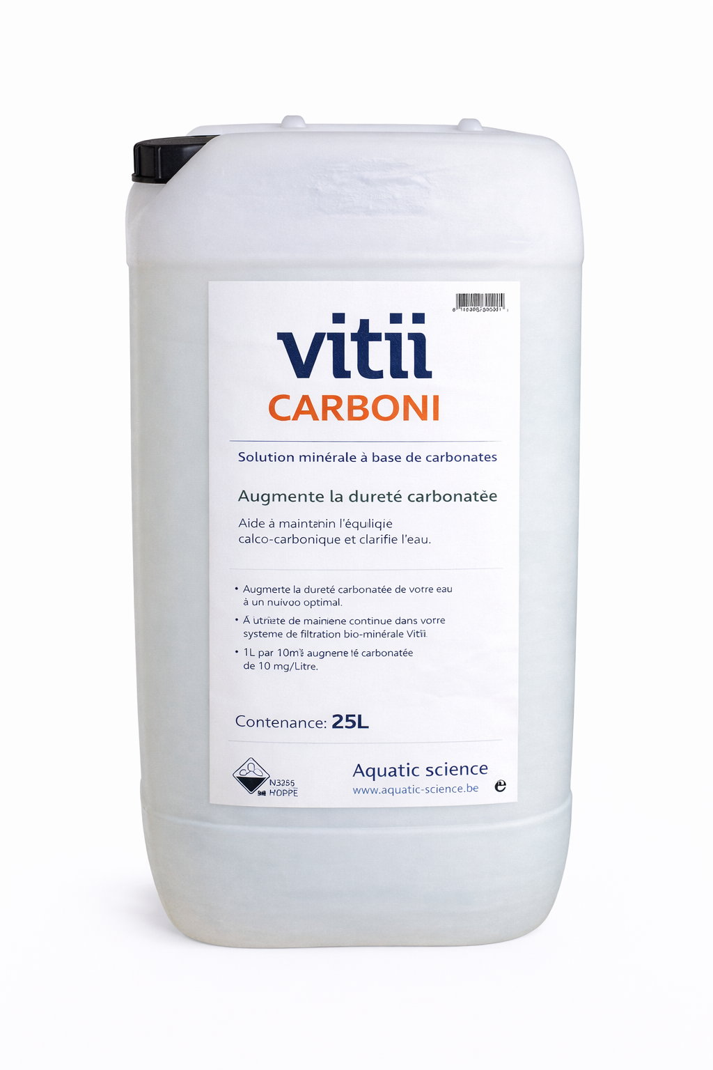 Vitii Carboni 25 L is een minerale oplossing op basis van carbonaten die de carbonaathardheid van het water verhoogt. Een stabiele carbonaathardheid is essentieel voor een goed functionerende filtratie en een gezonde waterbalans. Regenwater verlaagt de carbonaathardheid, terwijl verdamping door zon en wind deze juist kan concentreren. Daarom is het belangrijk om de mineraliteit van het water regelmatig te controleren, vooral na zware regenval en tijdens droge periodes.