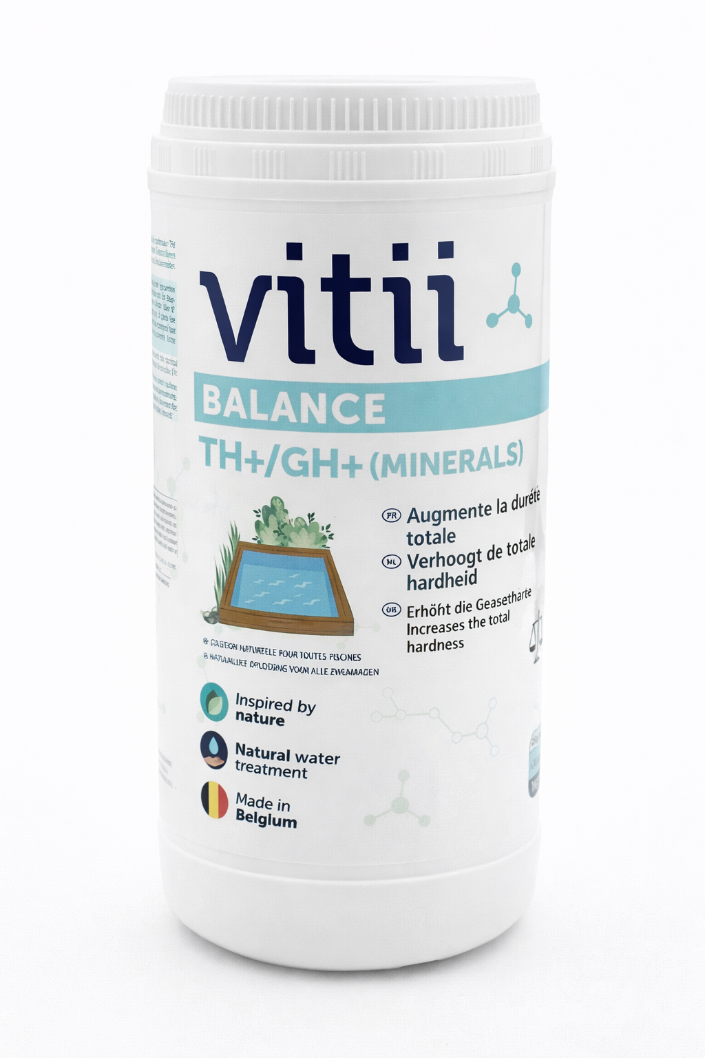 Regenwater verlaagt de totale hardheid, terwijl droge periodes en verdamping juist schommelingen kunnen veroorzaken. Daarom is het belangrijk om de GH/TH-waarde regelmatig te controleren, vooral na zware regenval en in droge periodes. Met Vitii Minéraux herstelt u snel en effectief het mineralengehalte van uw vijver of zwemwater.