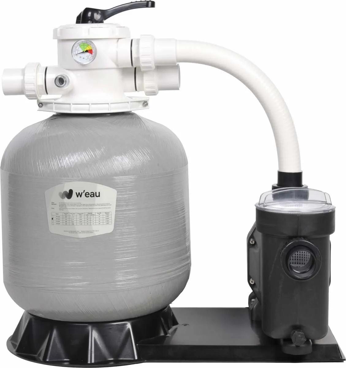 Overige kenmerken W'eau FPP De W'eau FPP zandfilterset wordt geleverd met een krachtige W'eau FPP zwembadpomp (maximaal 10m3 per uur). Deze zwembadpomp is voorzien van een voorfilter om grove vuildeeltjes op te vangen en wordt geleverd met een stekker met ingebouwde lekstroombeveiliging voor extra veiligheid.