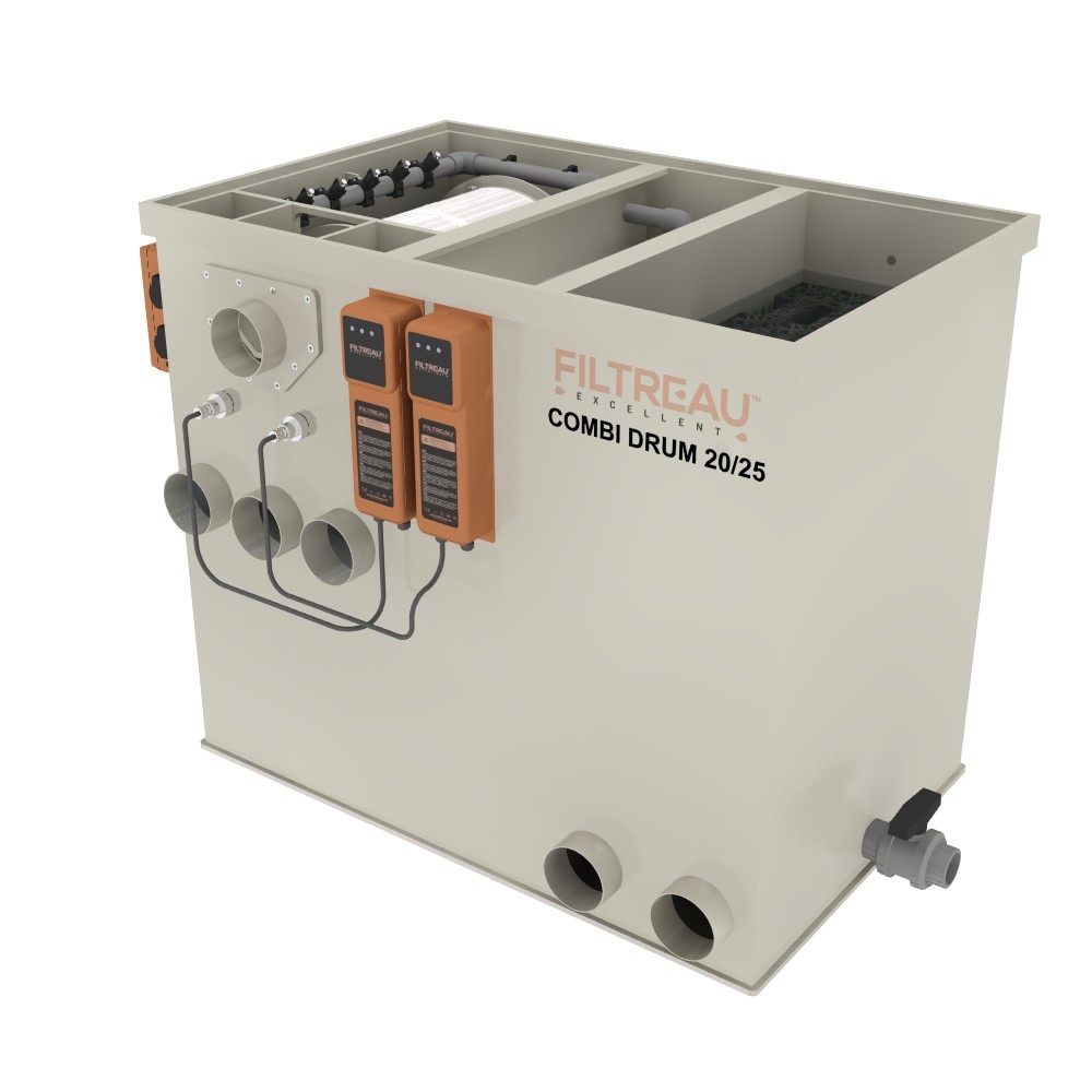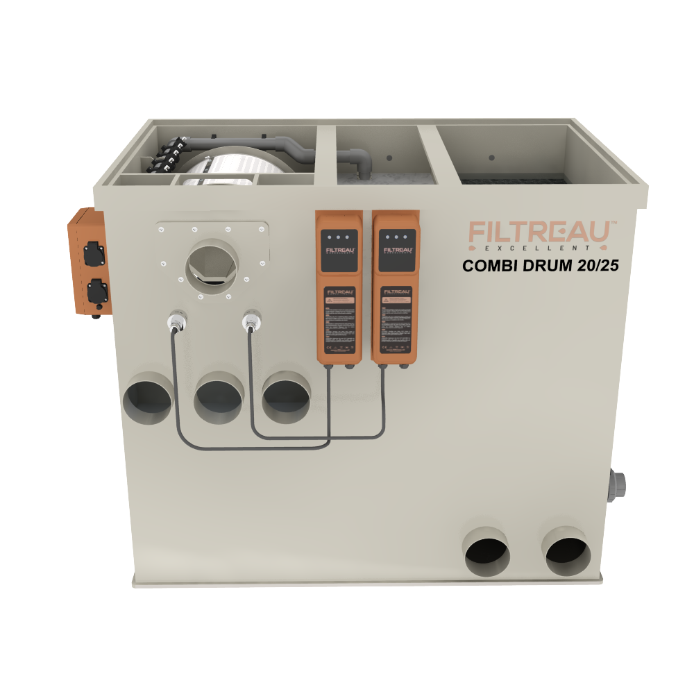 De Combi Drum 20/25 Trommelfilter Gravity is het kleinste model binnen de WMC Combi Drum-serie en speciaal ontwikkeld voor compacte koi- en siervijvers. Ondanks zijn bescheiden afmetingen levert dit systeem uitstekende filterprestaties door de combinatie van een volautomatische trommelfilter en een biologisch filtergedeelte. Dankzij de lage bouwhoogte en het compacte formaat is dit model ideaal voor vijversituaties met beperkte inbouwruimte.
