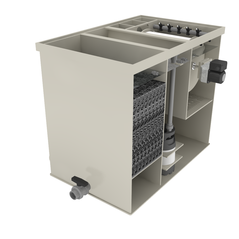De trommelfilter vangt automatisch zowel grof als fijn vuil af in een fijnmazig zeefdoek. Zodra het doek vervuild raakt, wordt automatisch een spoelprogramma gestart dat het vuil effectief afvoert. De doorstroming naar de vijver blijft hierbij constant, wat zorgt voor een stabiele en betrouwbare werking met minimaal onderhoud.