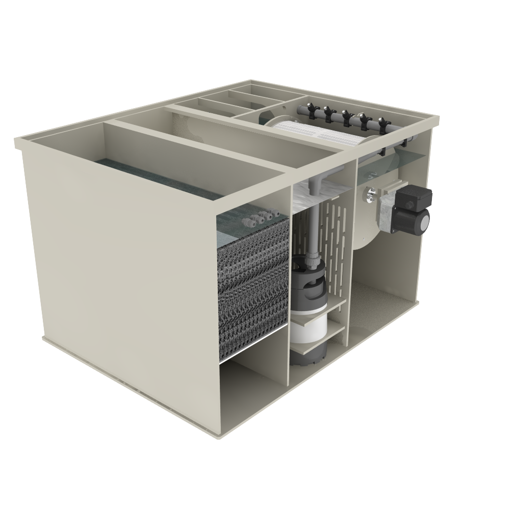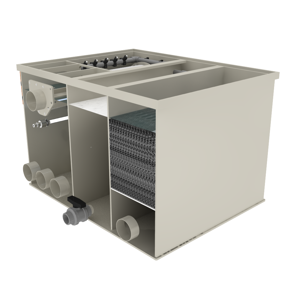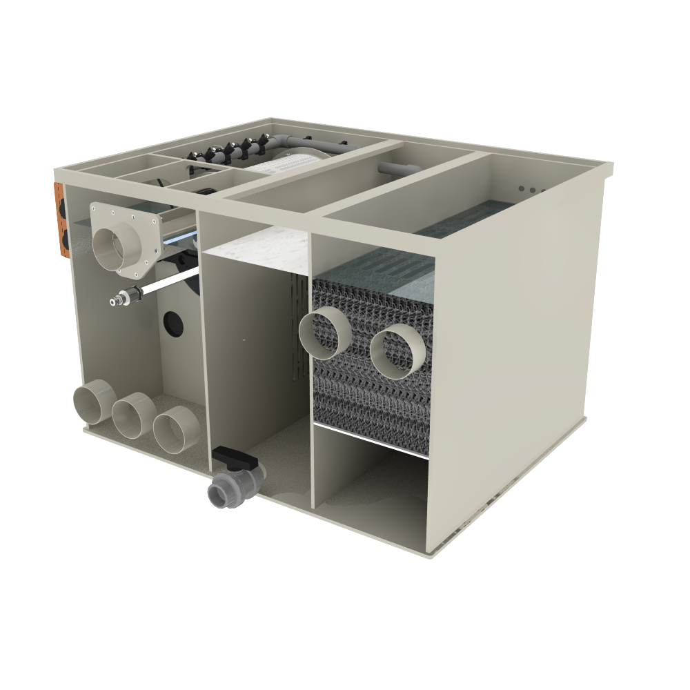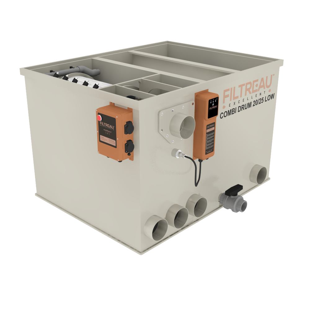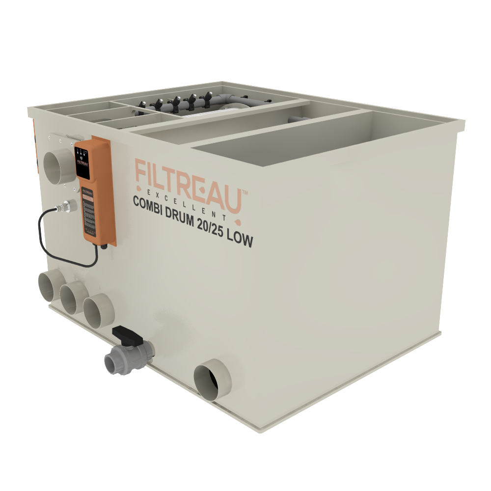 De Combi Drum 20/25 Low Trommelfilter Gravity is het kleinste model binnen de WMC-serie en ideaal voor compacte koi- of siervijvers. Door de lage bouwhoogte kan dit filter eenvoudig worden ingebouwd in beperkte ruimtes, zonder in te leveren op prestaties. Het systeem combineert een automatische trommelfilter voor de mechanische reiniging met een biologisch filtergedeelte dat zorgt voor stabiel en gezond vijverwater.