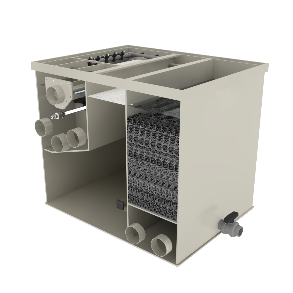 De trommelfilter verwijdert automatisch grof en fijn vuil uit het vijverwater. Zodra het zeefdoek vervuild raakt, start een spoelcyclus die het vuil effectief afvoert. Dit proces verloopt zonder onderbreking van de waterstroom naar de vijver, waardoor het systeem constant blijft presteren met minimaal onderhoud.