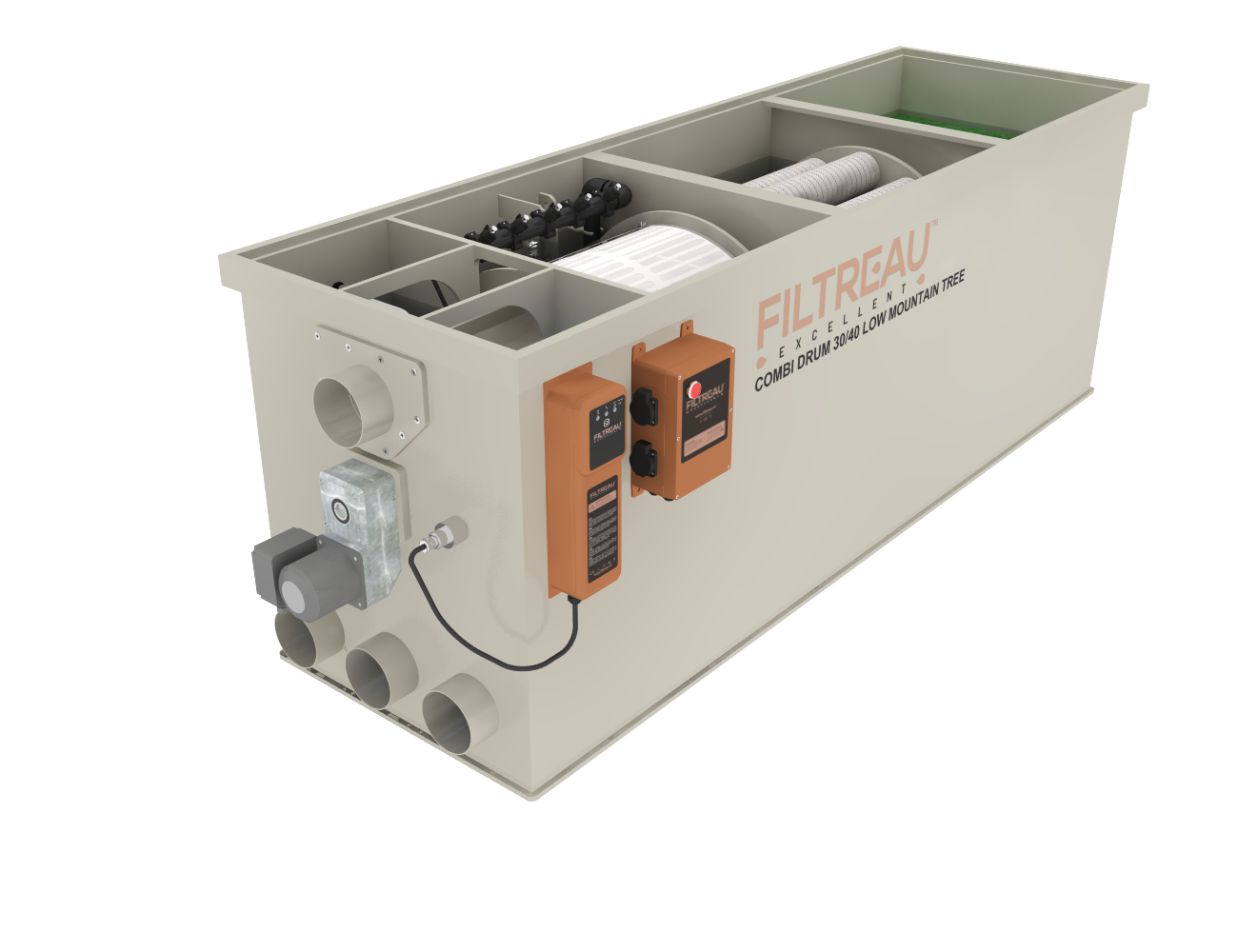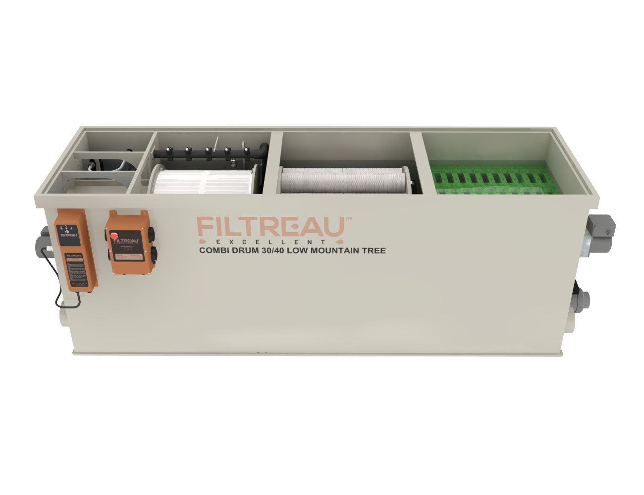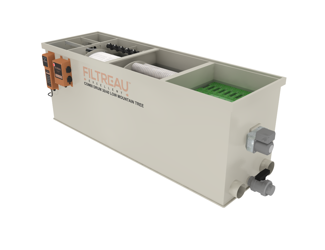 De Combi Drum 30/40 Low Mountain Tree Gravity is een compacte en lage uitvoering binnen de Combi Drum-serie. Dit model is speciaal ontwikkeld voor vijversituaties waar de beschikbare inbouwhoogte beperkt is, zonder in te leveren op prestaties. Het systeem combineert een volautomatische trommelfilter met een biologisch filtergedeelte dat gevuld is met Mountain Tree filtermedia. Hierdoor worden zwevende vuildeeltjes direct uit het water verwijderd en wordt tegelijkertijd een stabiel biologisch evenwicht gegarandeerd.