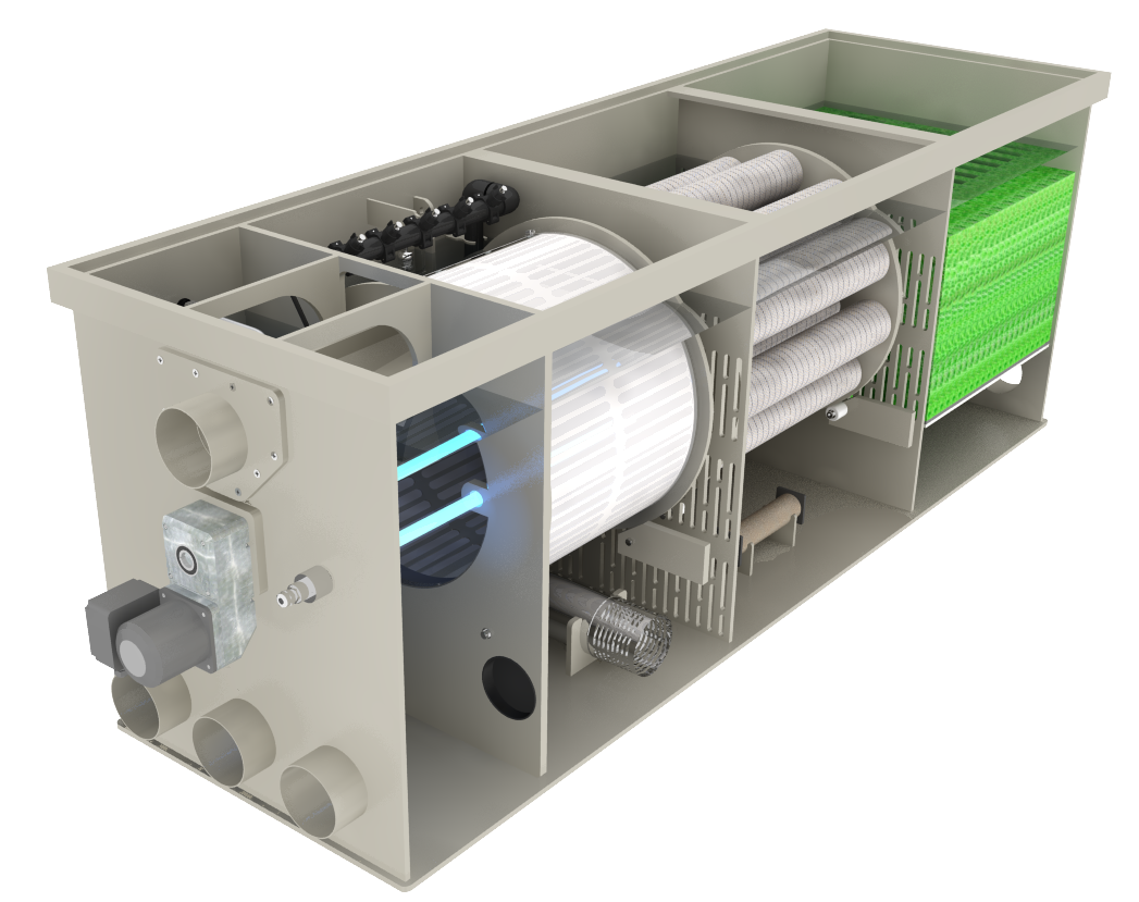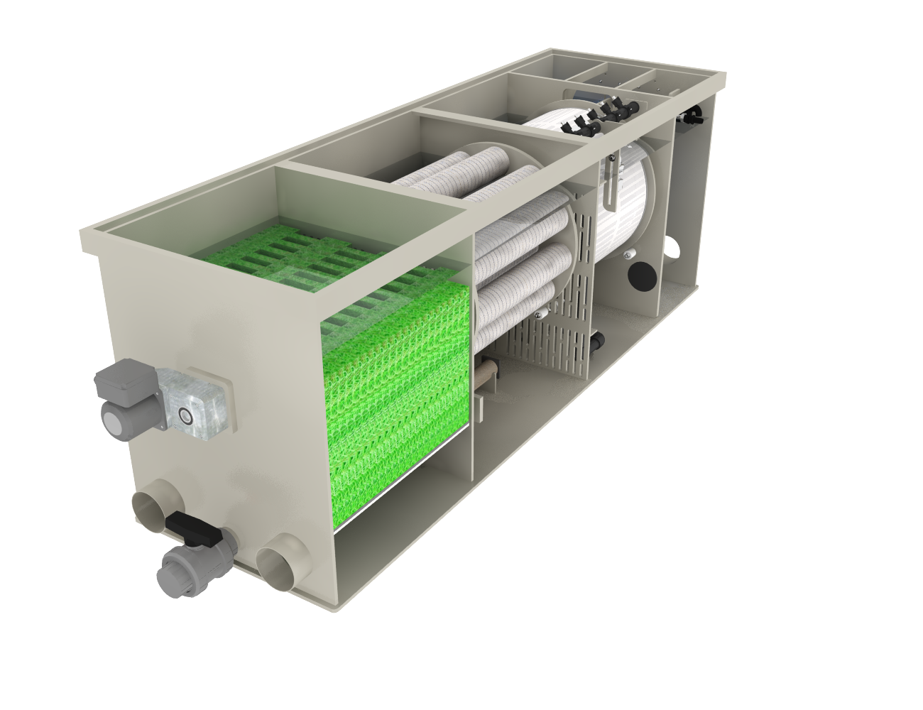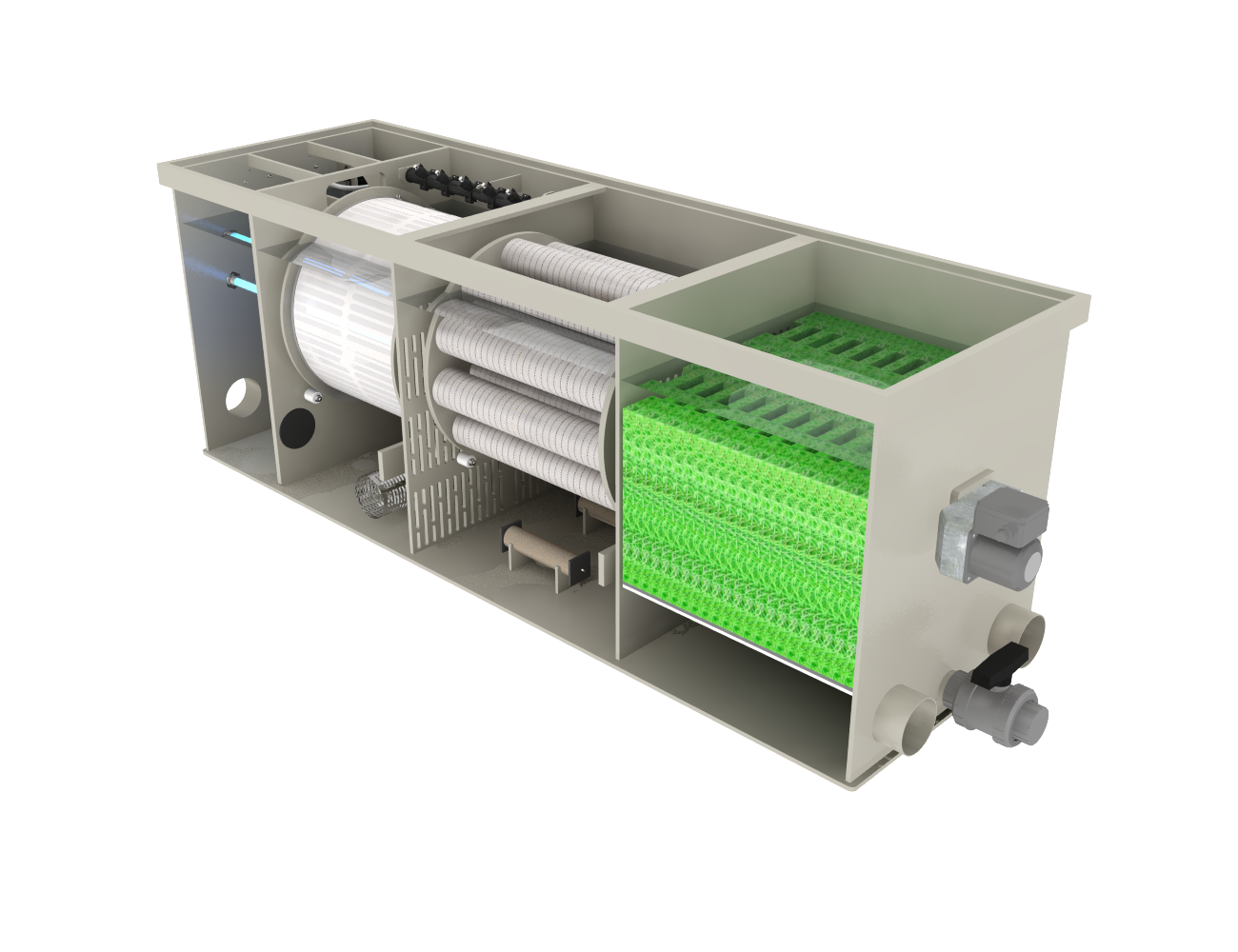 De Combi Drum 30/40 Low Mountain Tree Gravity is een compacte en lage uitvoering binnen de Combi Drum-serie. Dit model is speciaal ontwikkeld voor vijversituaties waar de beschikbare inbouwhoogte beperkt is, zonder in te leveren op prestaties. Het systeem combineert een volautomatische trommelfilter met een biologisch filtergedeelte dat gevuld is met Mountain Tree filtermedia. Hierdoor worden zwevende vuildeeltjes direct uit het water verwijderd en wordt tegelijkertijd een stabiel biologisch evenwicht gegarandeerd.