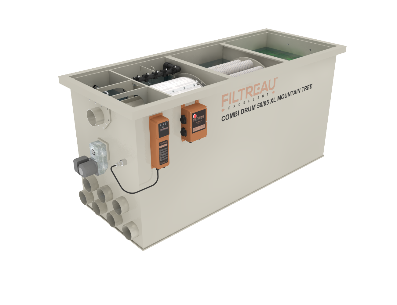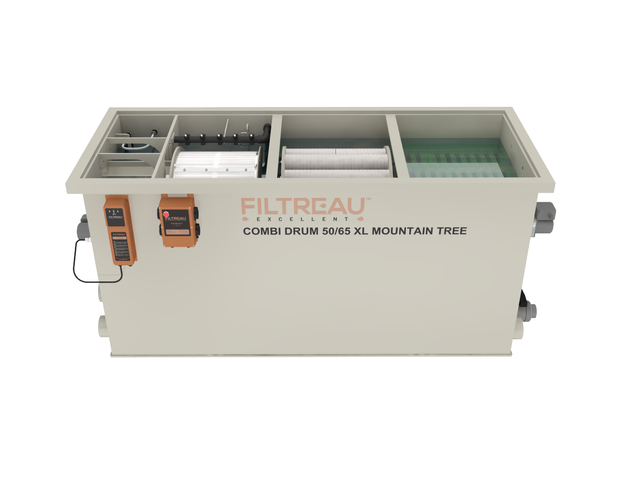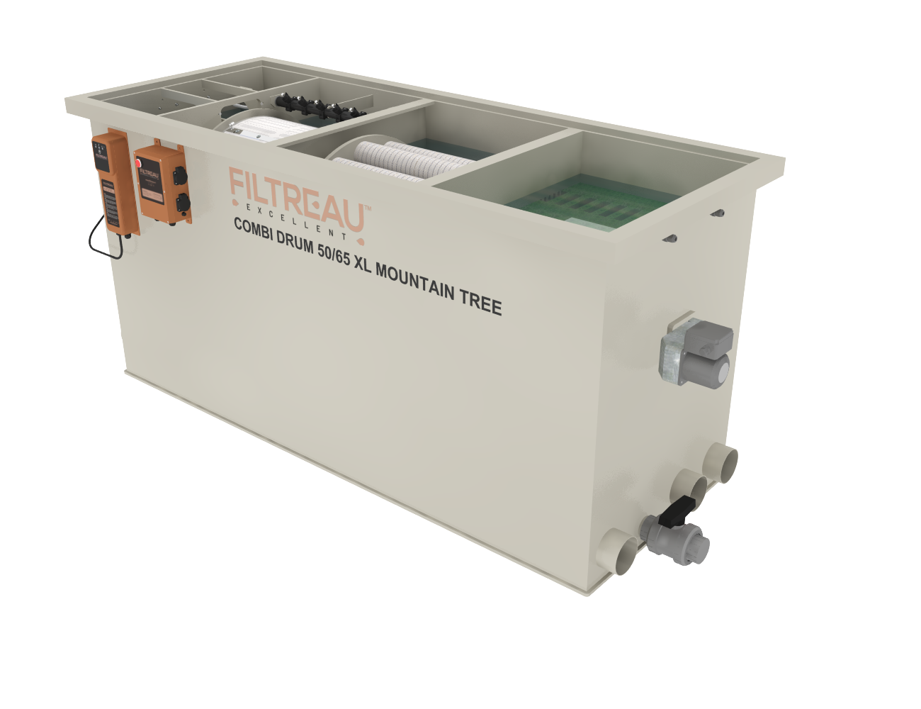 De Combi Drum 50/65 XL Mountain Tree Gravity is een krachtige filteroplossing voor grote koi- en zwemvijvers. Met zijn royale biologische filtergedeelte en de geïntegreerde volautomatische trommelfilter biedt dit systeem een ideale balans tussen mechanische en biologische filtratie. Het XL-model onderscheidt zich door extra capaciteit, waardoor het uitermate geschikt is voor vijvers met een hoge visbezetting en intensieve belasting.