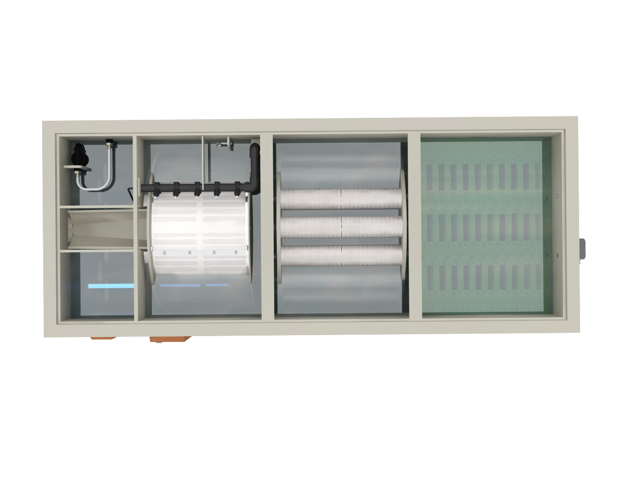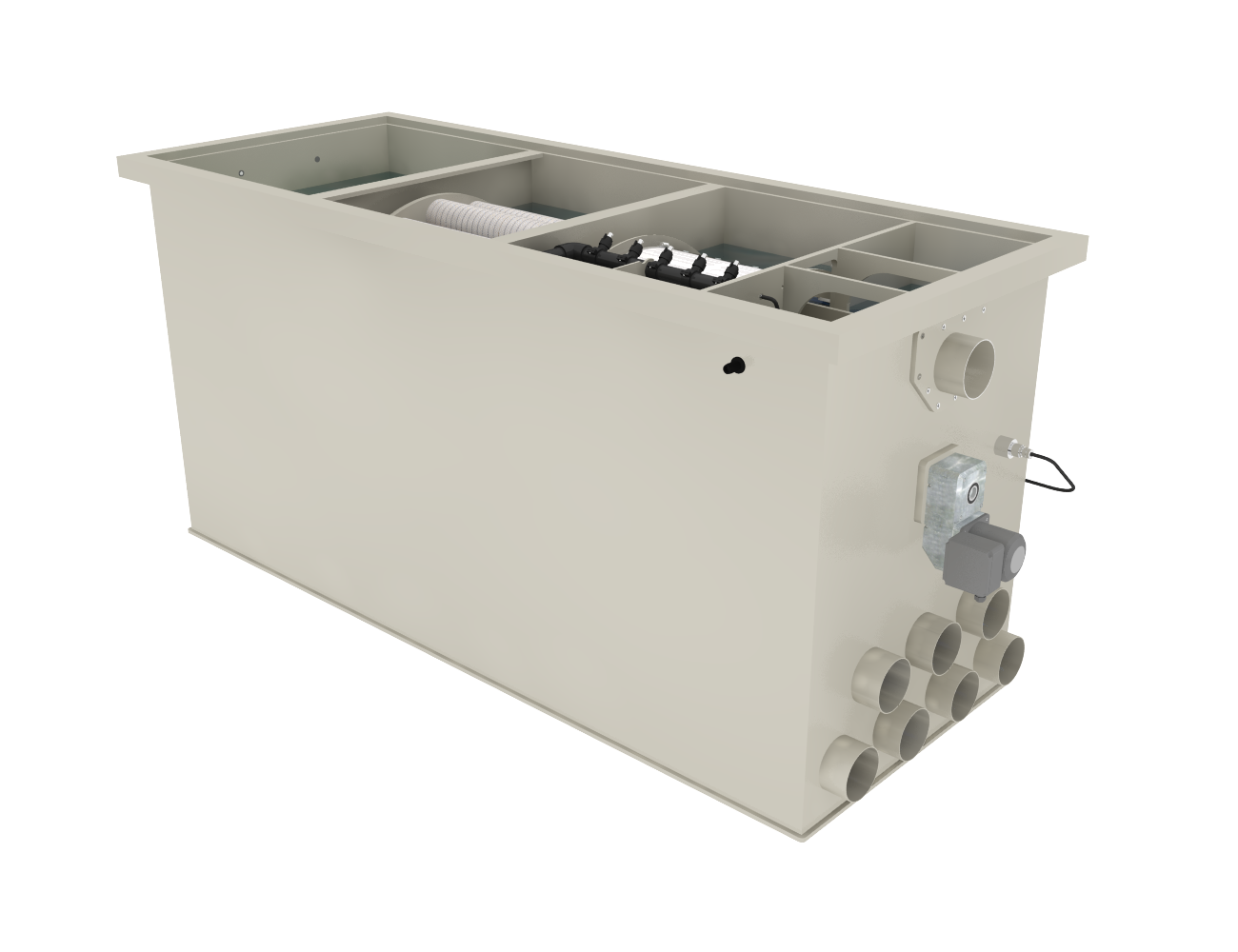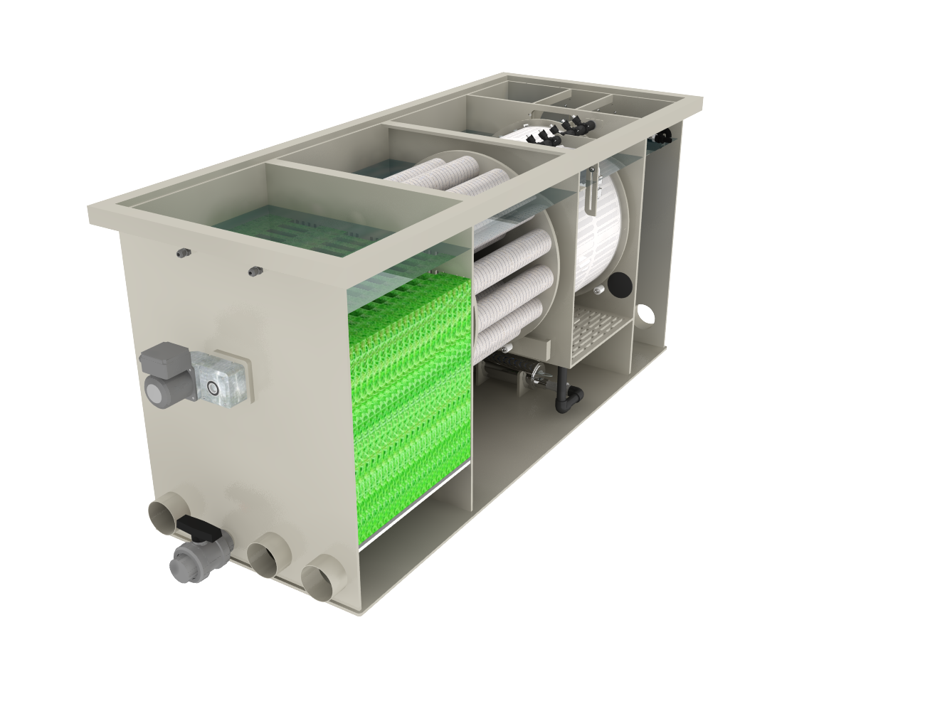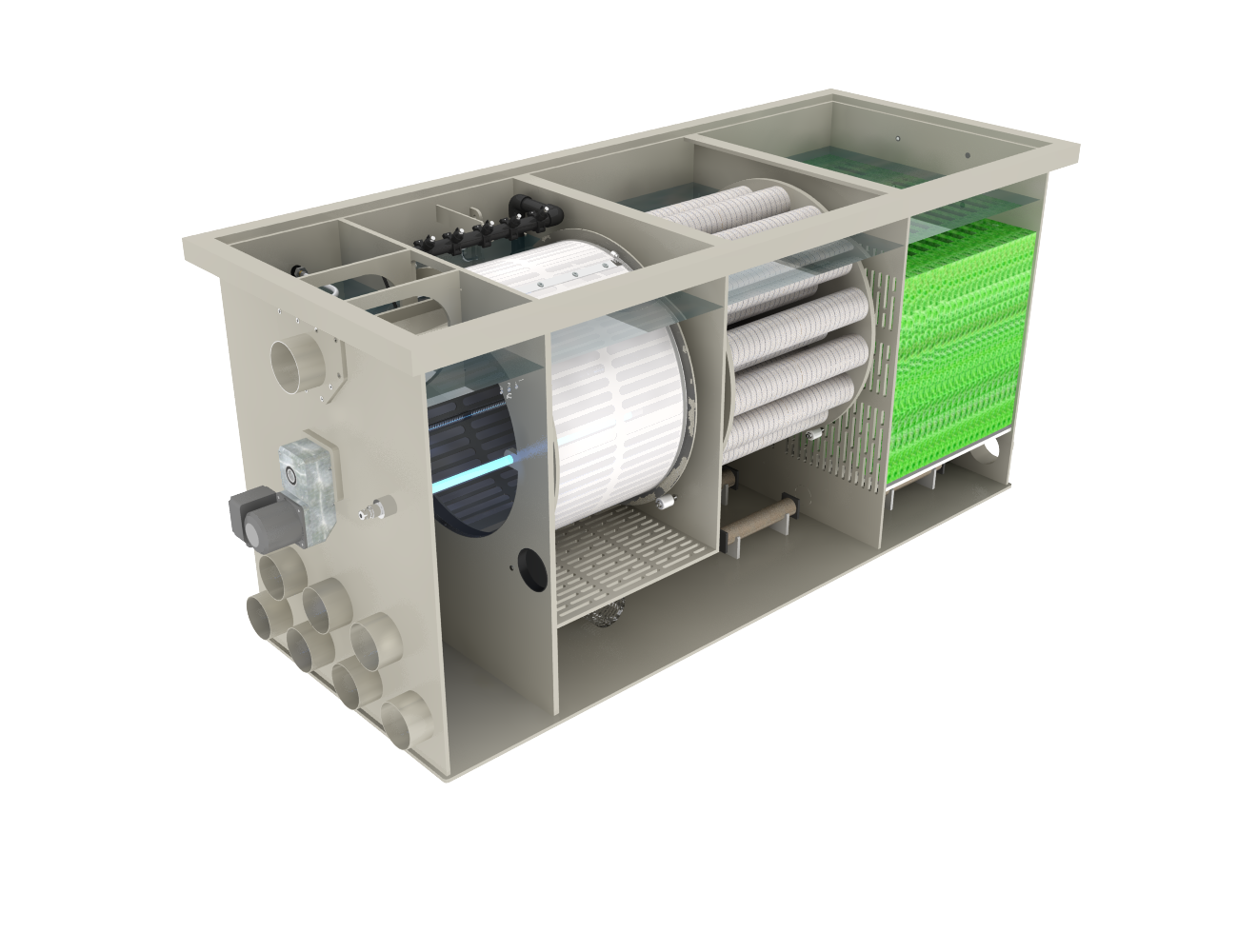 De filterkamer is uitgerust met Mountain Tree filtermaterialen, zoals de Lotus Root Bacteria House II en de Spiral Filter Mat. Dankzij deze geavanceerde materialen beschikt het systeem over een zeer groot kolonisatieruimte voor nuttige bacteriën, waardoor de biologische afbraakcapaciteit wordt gemaximaliseerd. Dit maakt het filter uiterst betrouwbaar voor vijvers waar helder en stabiel water een vereiste is.