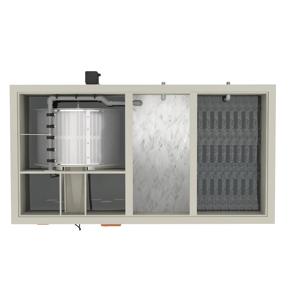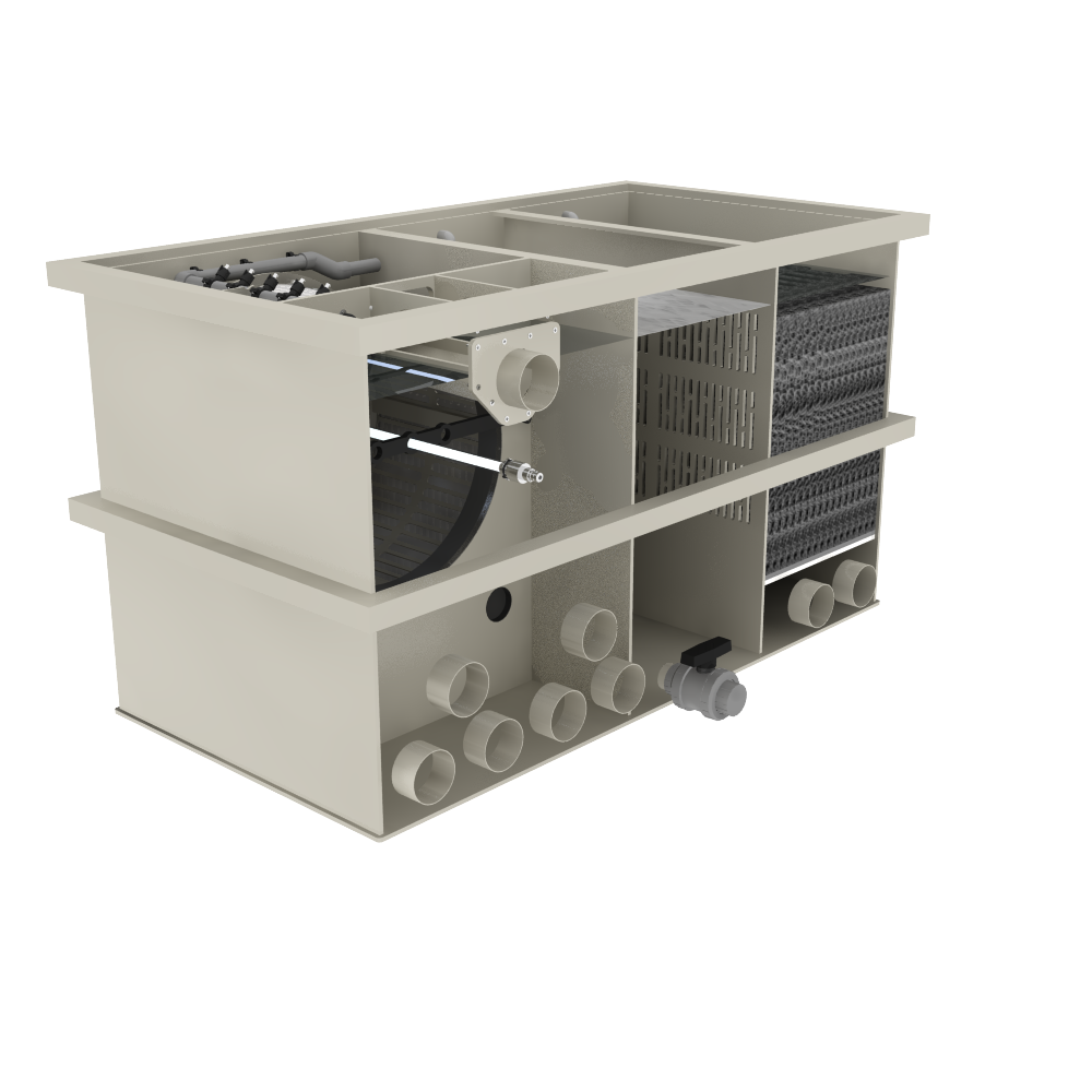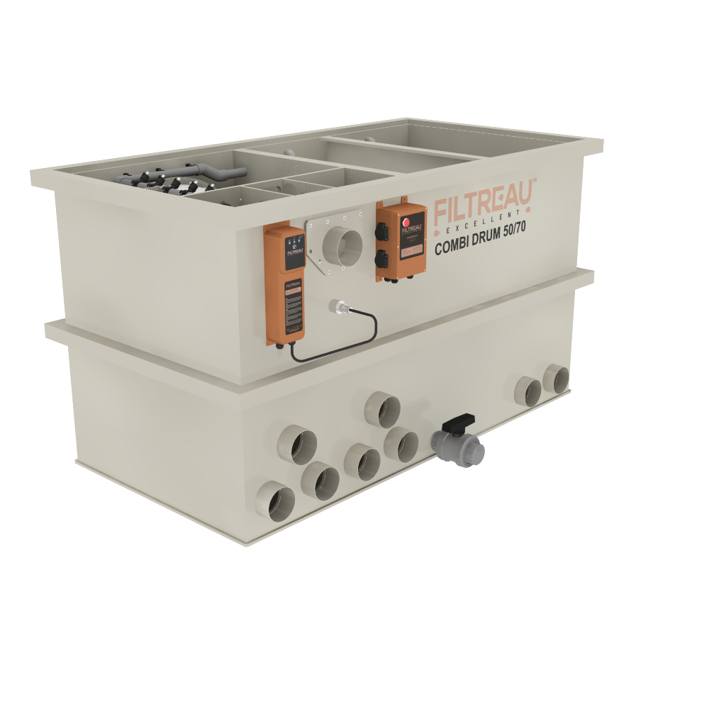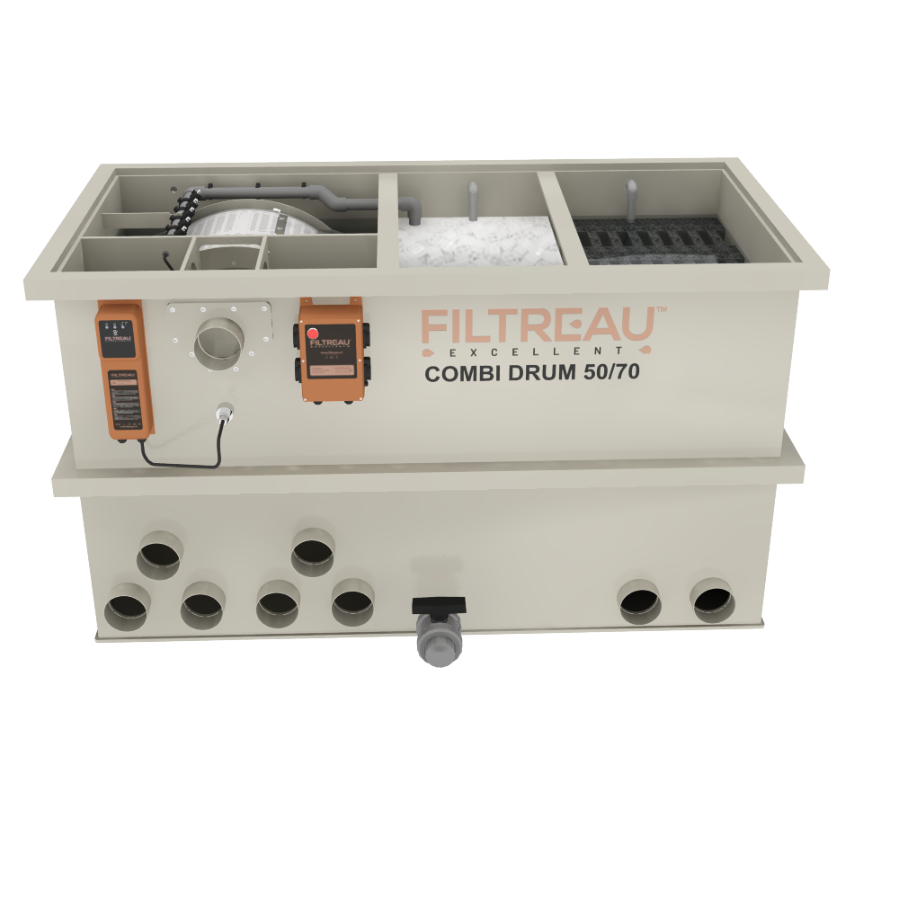 De Combi Drum 50/70 Trommelfilter Gravity is een robuuste filterinstallatie, ontwikkeld voor middelgrote tot grote koi- en zwemvijvers. Dit model combineert een volautomatische trommelfilter die grof en fijn vuil direct verwijdert, met een ruim biologisch filtergedeelte waar schadelijke stoffen effectief worden afgebroken. Het systeem is onderhoudsarm, betrouwbaar en levert constante waterkwaliteit, ook bij een hoge visbezetting.