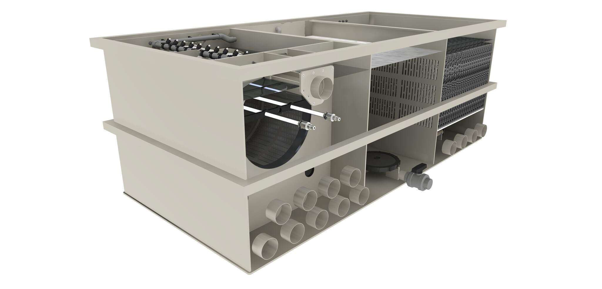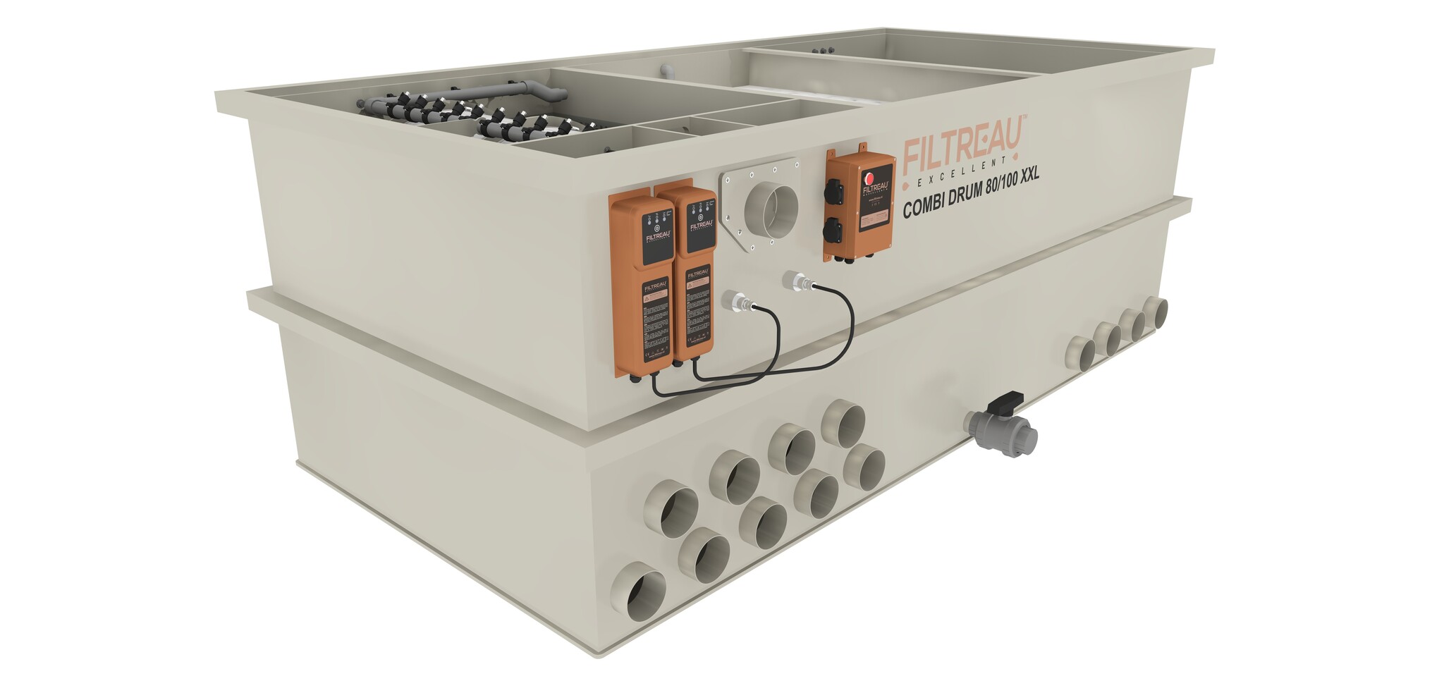 De Filtreau WMC Combi Drum 80/100 XXL Trommelfilter Gravity is het grootste en meest krachtige model binnen de WMC-serie. Dit systeem is speciaal ontwikkeld voor zeer grote koi- en zwemvijvers en biedt maximale capaciteit en betrouwbaarheid. Het filter combineert een volautomatische trommelfilter voor de mechanische afvang van vuil met een royaal biologisch filtergedeelte, wat zorgt voor stabiel en helder vijverwater – zelfs bij een hoge visbezetting en zware belasting.