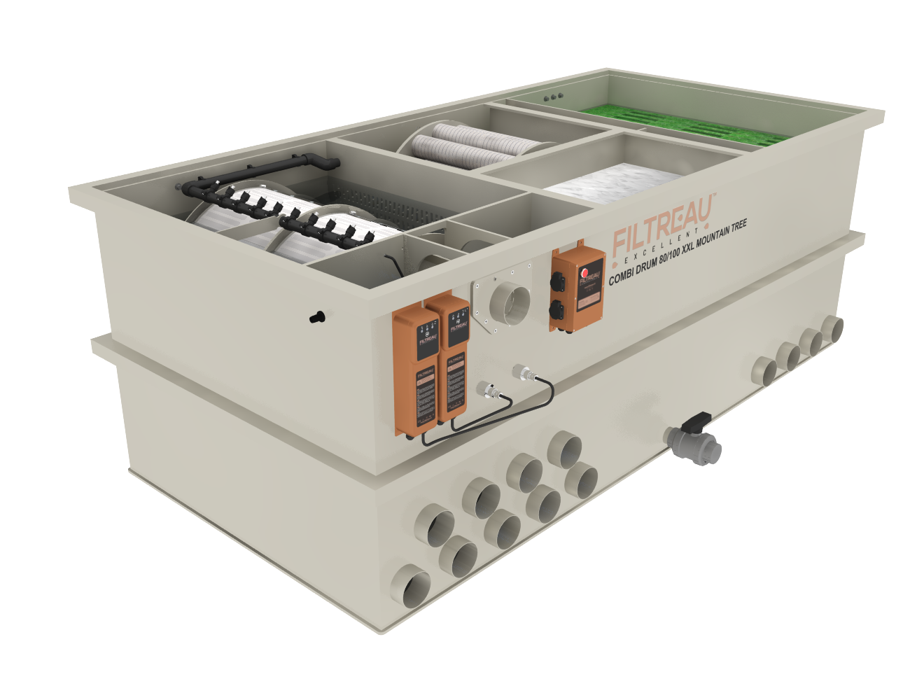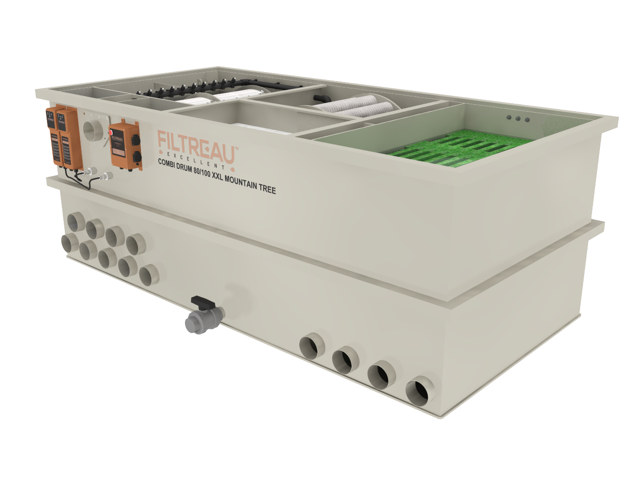 De Combi Drum 80/100 XXL Mountain Tree Gravity is een geavanceerd en onderhoudsvriendelijk filter, ontwikkeld voor middelgrote tot zeer grote koi- en zwemvijvers. Dit alles-in-één systeem combineert een volautomatische trommelfilter met een krachtig biologisch filter. Hierdoor worden vuildeeltjes effectief verwijderd en blijft het water biologisch gezond en stabiel.