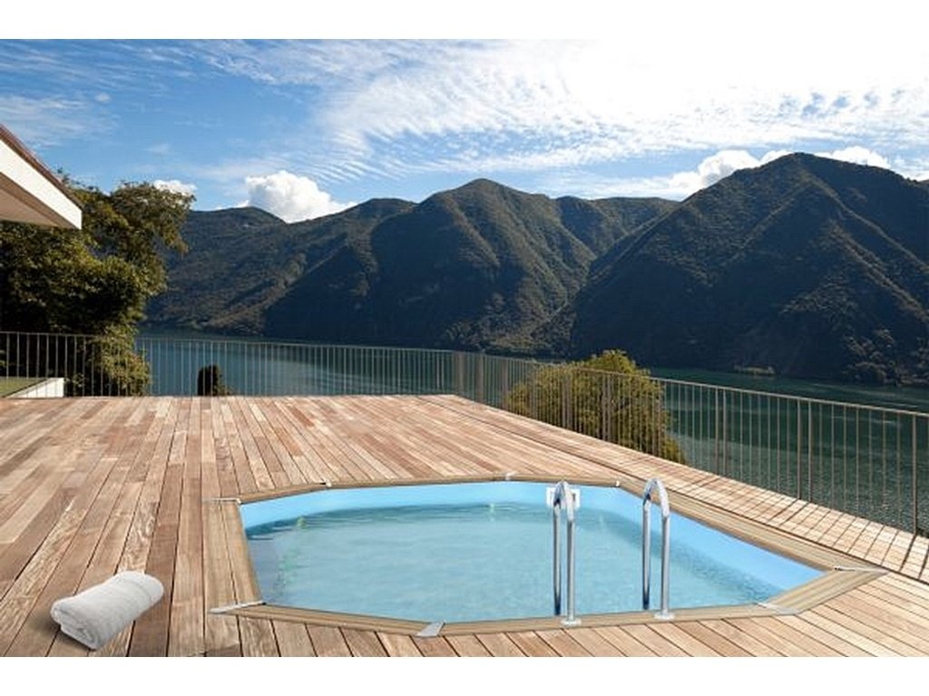 • Zwembadconstructie van hout met liner en ondertapijt.