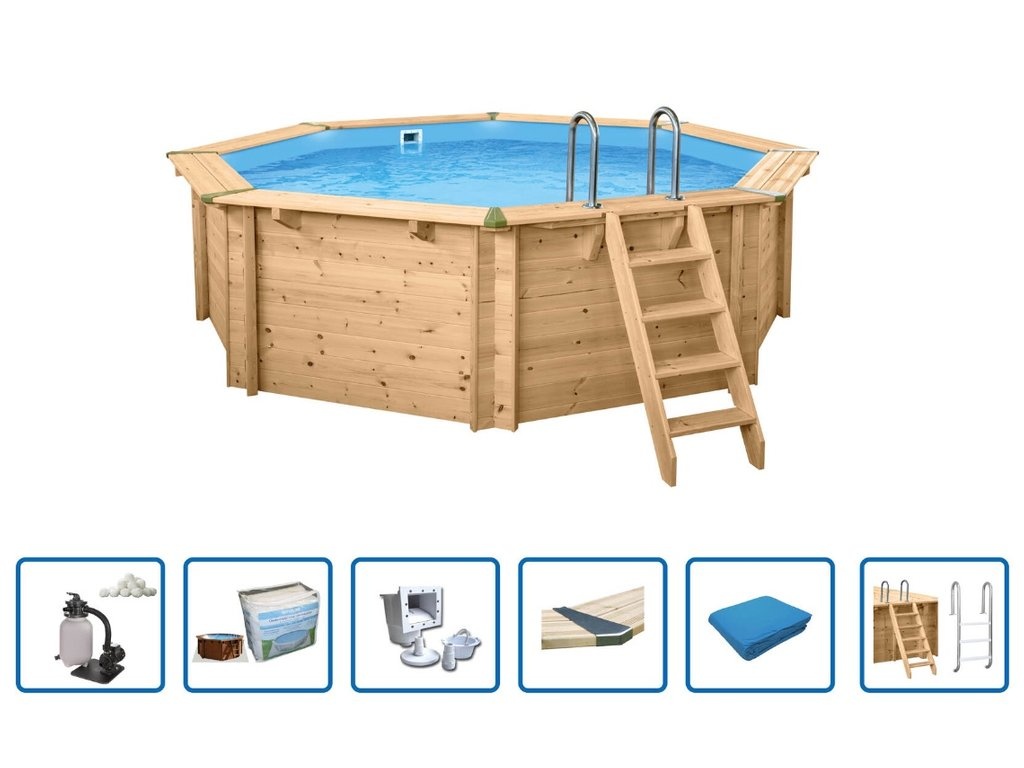 Het gebruikte Nordic Pine hout staat bekend om zijn duurzaamheid en sterkte. De houten balken worden eerst gedroogd tot een vochtpercentage van ongeveer 18% – 22%, waarna ze worden behandeld met een klasse 4 vacuümdruk-impregnatie. Bij deze techniek wordt het impregneermiddel onder hoge druk diep in het hout geperst, waardoor het hout langdurig beschermd is tegen vocht, schimmels en insecten. De zwembadwanden zijn bovendien 45 mm dik, wat zorgt voor een zeer stevige constructie en uitstekende thermische isolatie.